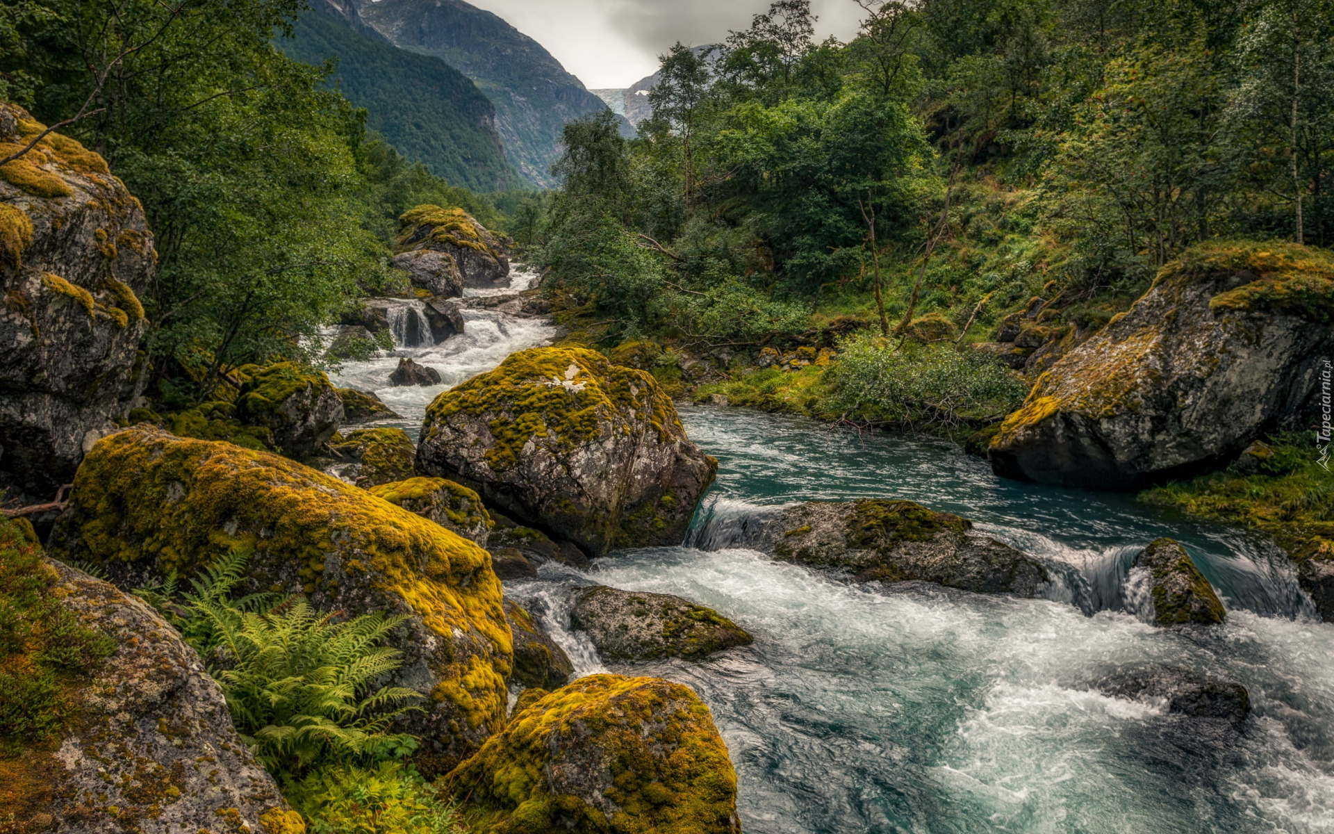 Edytor tapety: Paprocie przy omszałych kamieniach nad rzeką