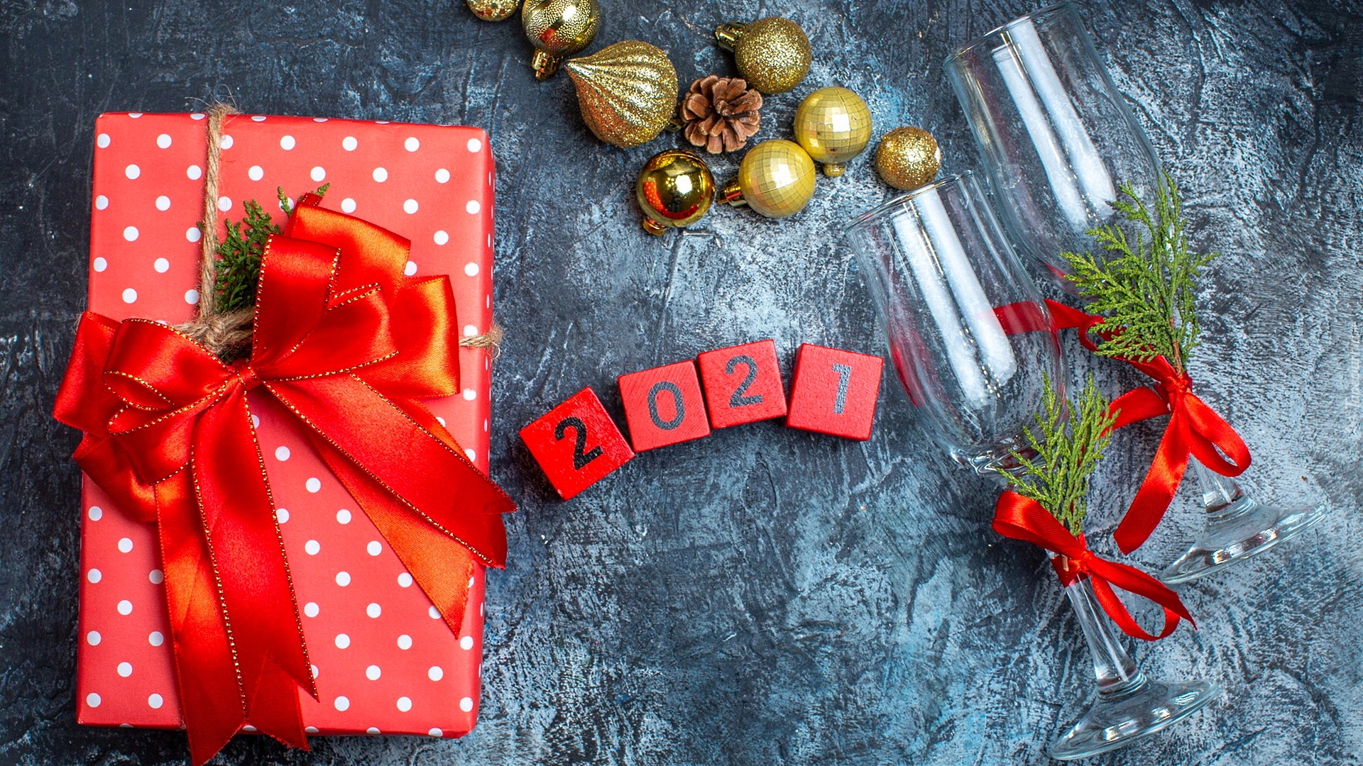 Edytor tapety: Klocki z datą 2021 obok prezentu i kieliszków