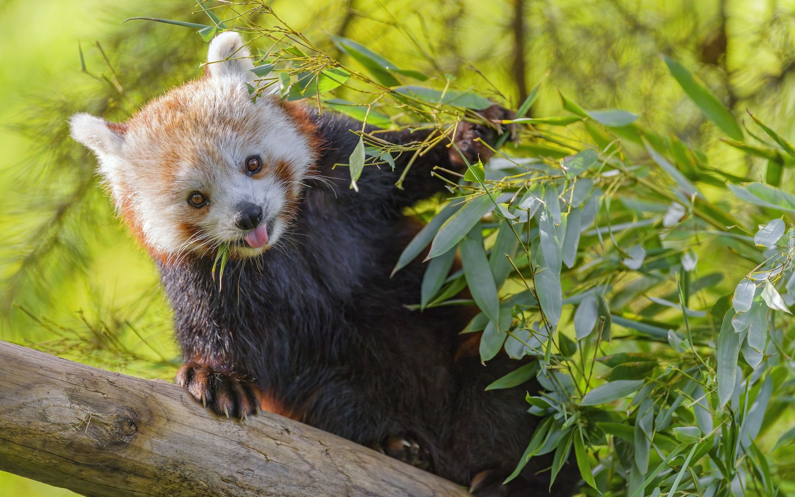 Edytor tapety: Pandka ruda obok liściastych gałązek