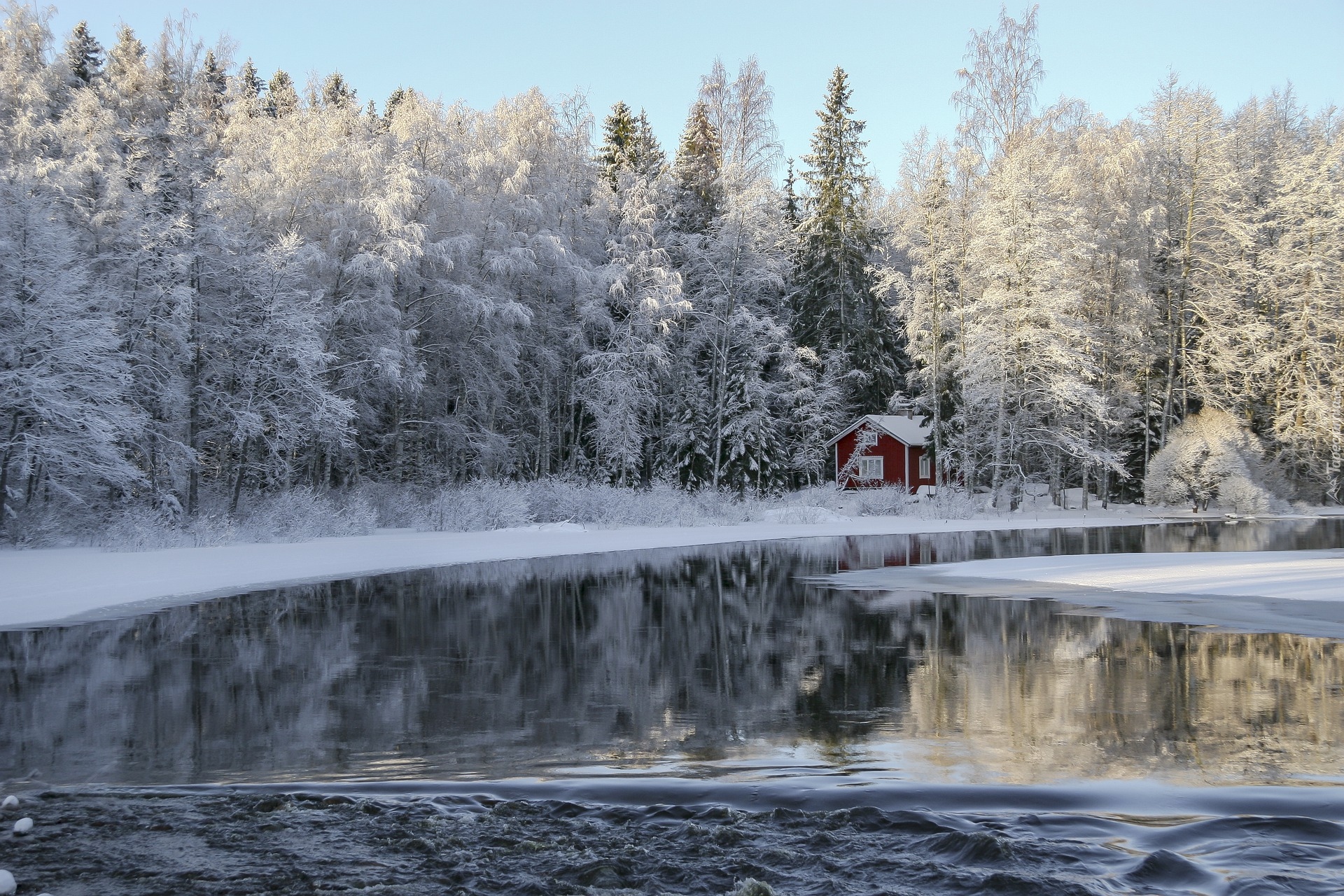 Edytor tapety: Czerwony dom pod ośnieżonym lasem na brzegu rzeki