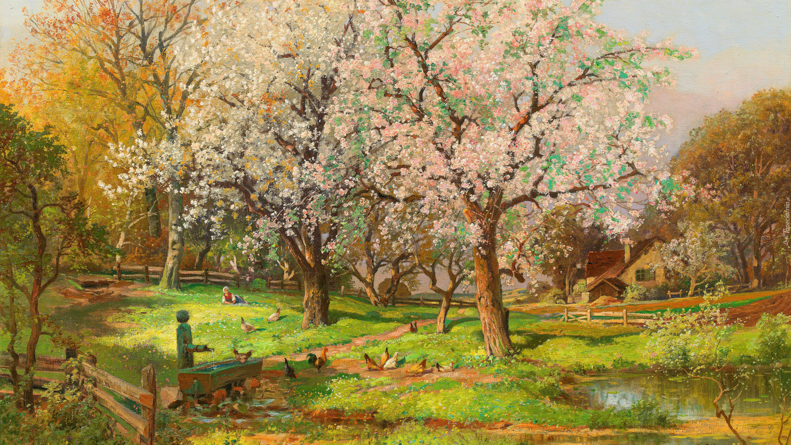 Edytor tapety: Kwitnące drzewa w sadzie na obrazie Aloisa Arneggera