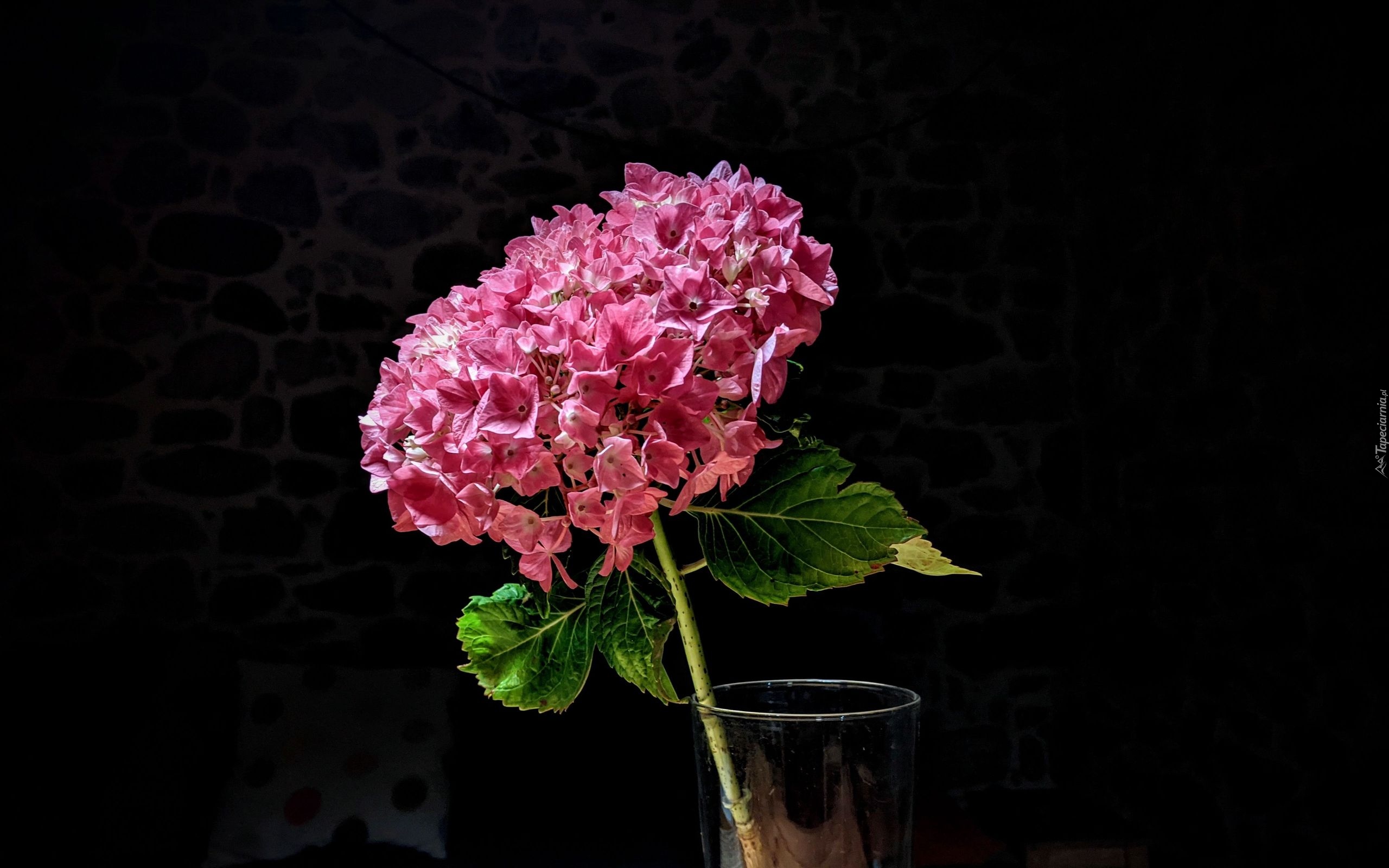 Edytor tapety: Kwiat hortensji różowej w szklanym naczyniu
