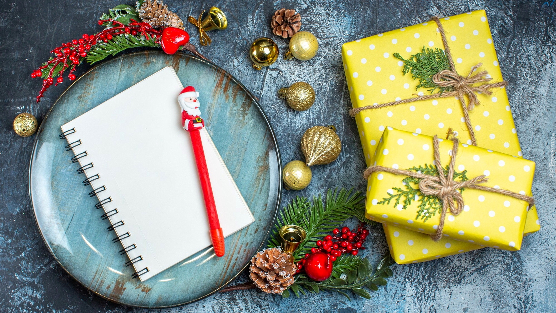 Edytor tapety: Notatnik na talerzu obok prezentów