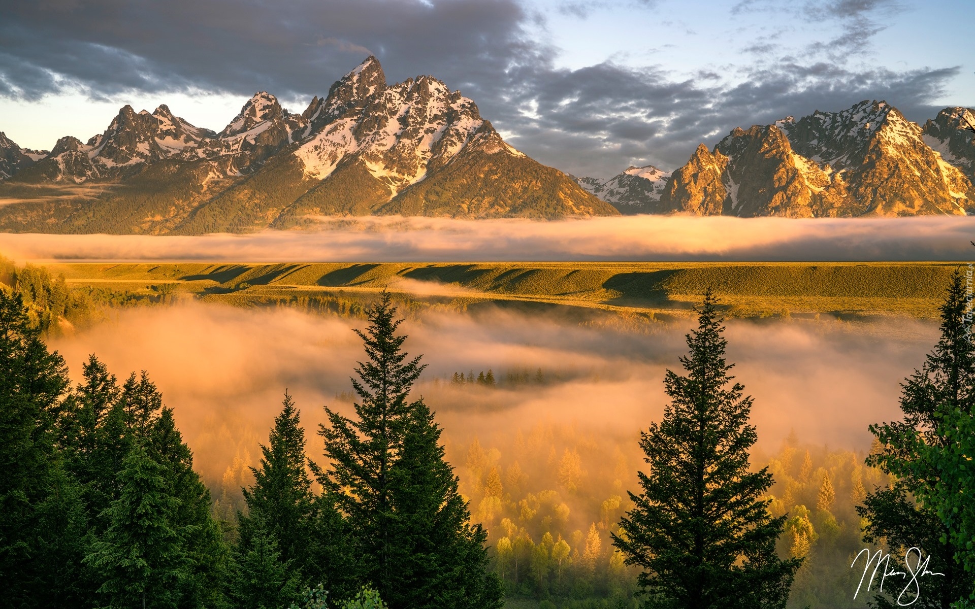 Edytor tapety: Opadająca mgła nad drzewami w górach Teton Range