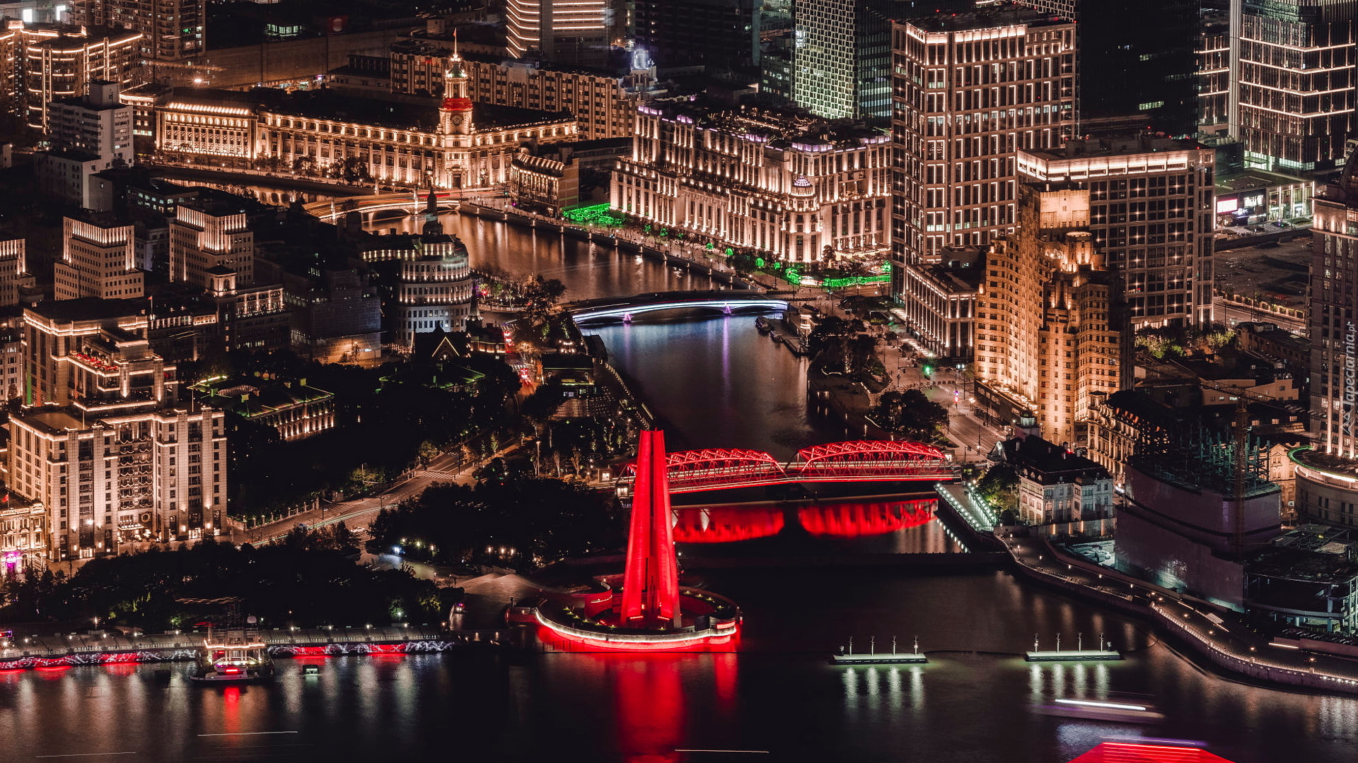 Edytor tapety: Oświetlone domy i mosty nad rzeką