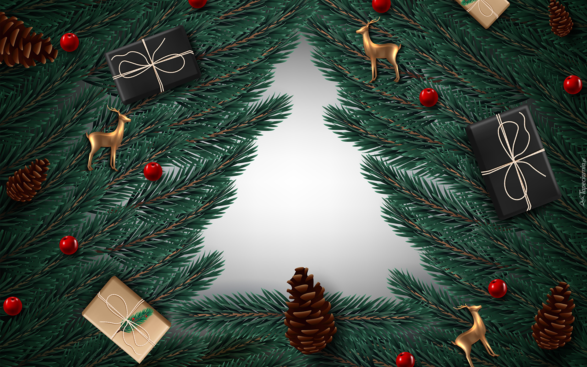 Edytor tapety: Ozdoby świąteczne na ułożonych w kształcie choinki gałązkach