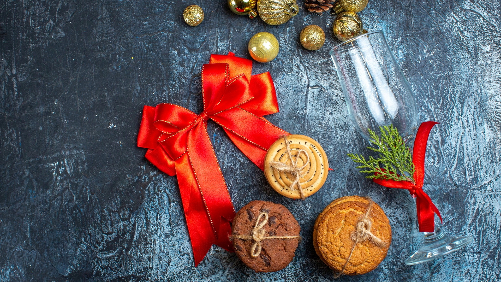 Edytor tapety: Czerwona kokarda obok ciastek i kieliszka