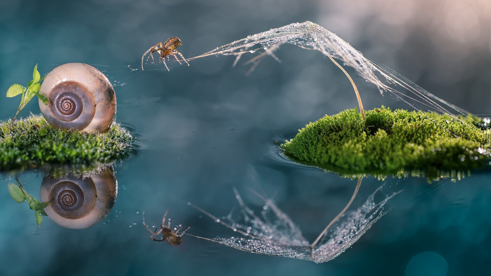 Edytor tapety: Pająk na pajęczynie i muszelka na kępce mchu