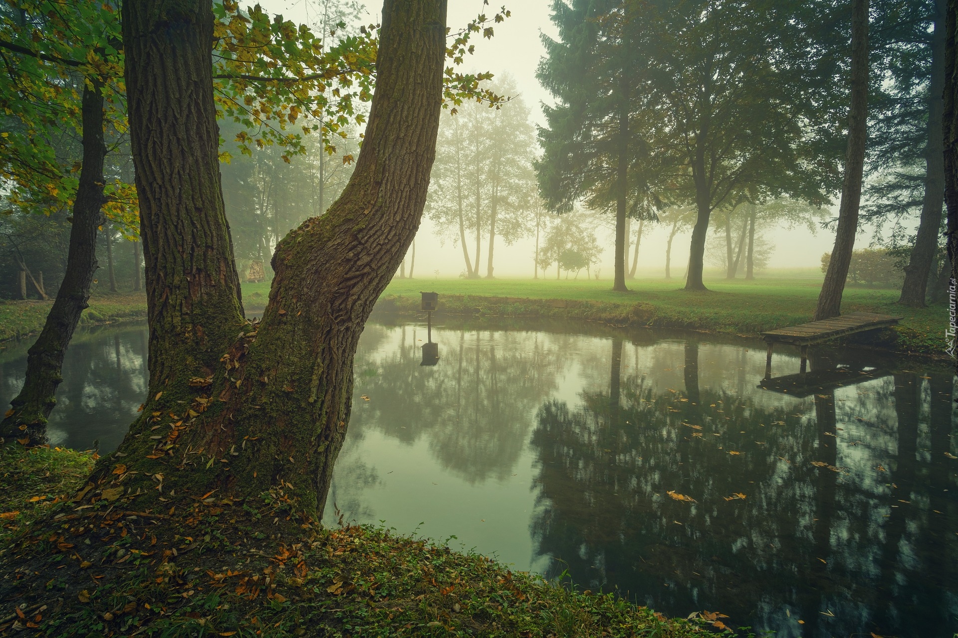 Edytor tapety: Drzewa i pomost nad stawem w zamglonym parku