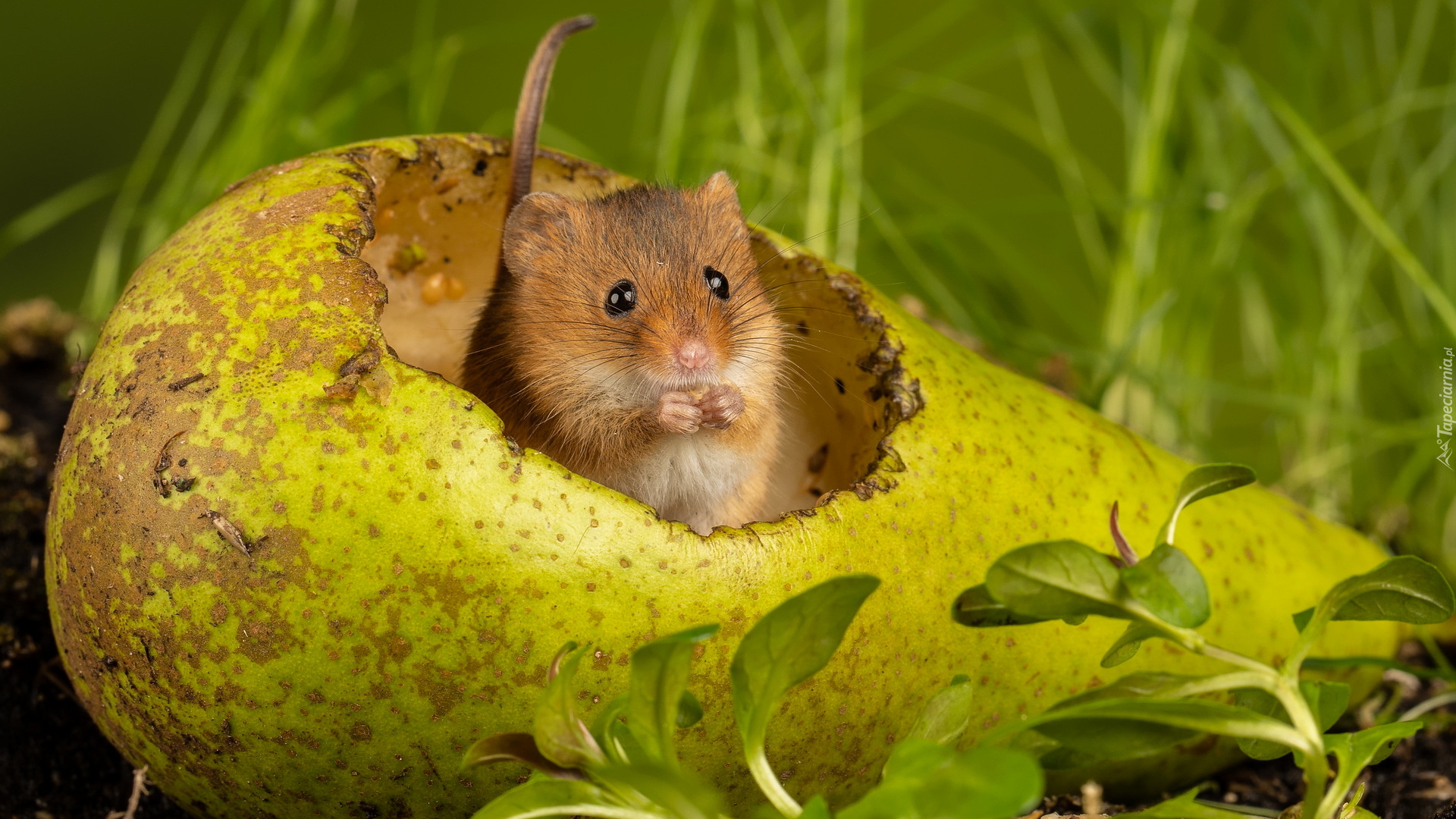 Edytor tapety: Myszka w nadgryzionej gruszce
