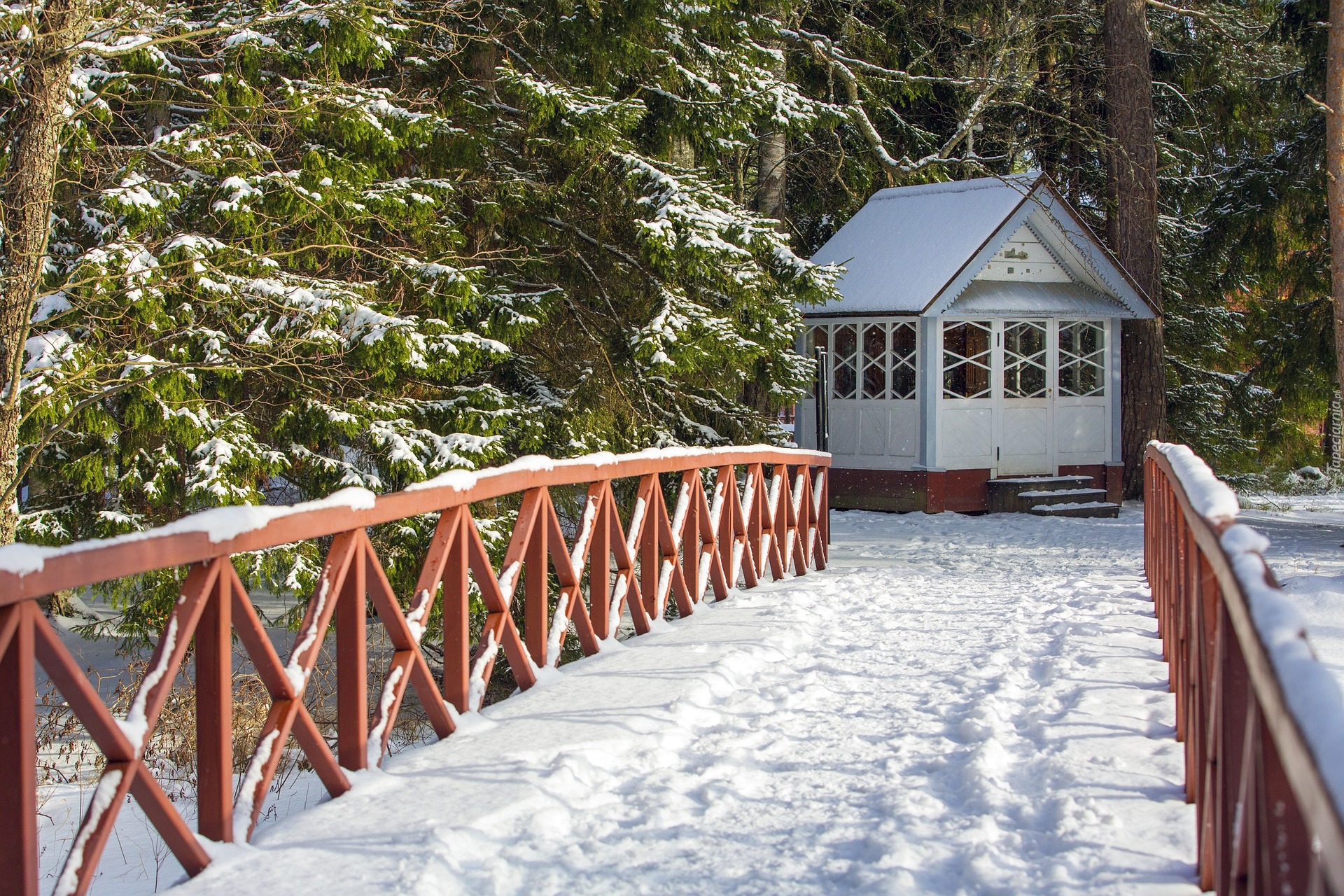 Edytor tapety: Domek pod lasem przy zasypanym śniegiem moście