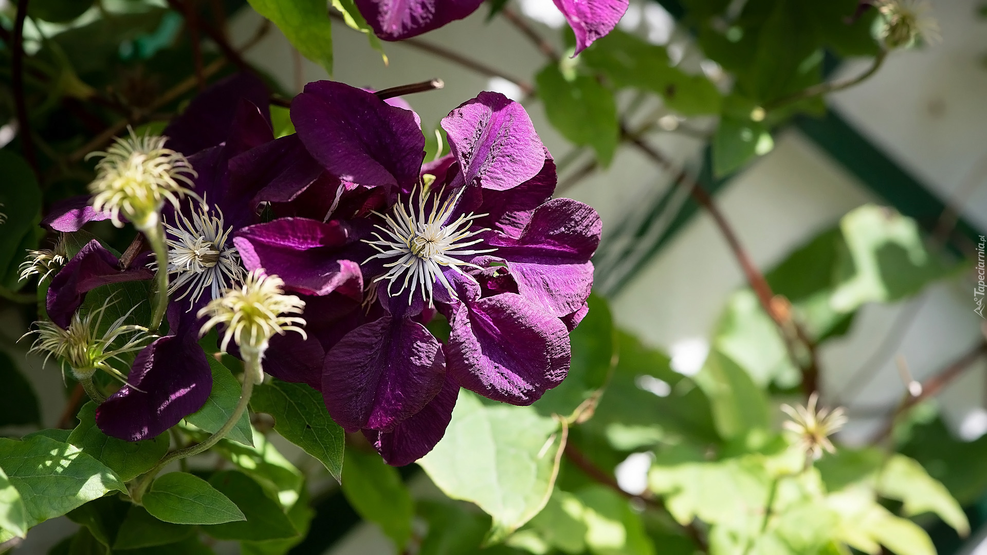 Edytor tapety: Rozkwitnięte fioletowe powojniki z liśćmi