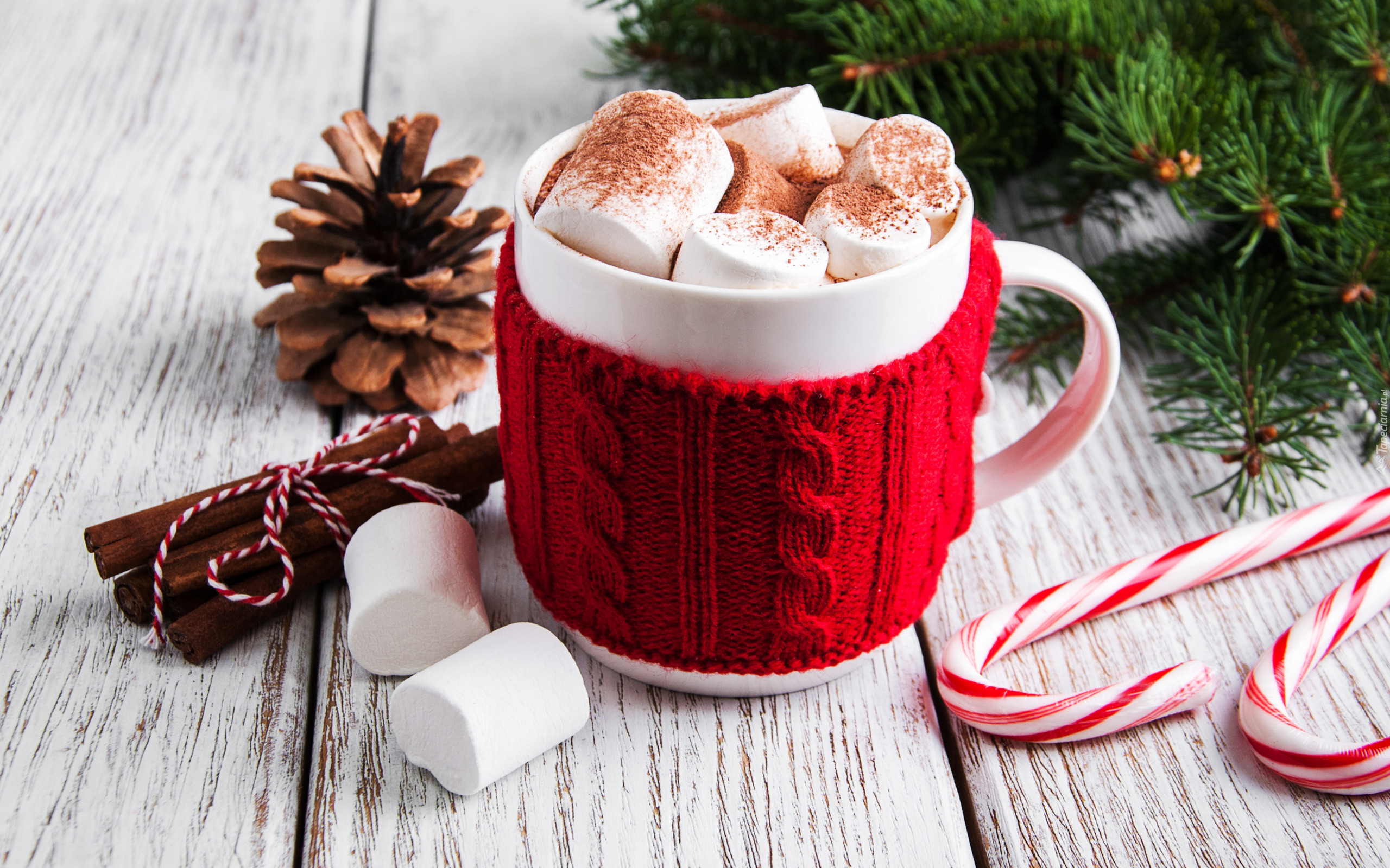 Edytor tapety: Pianki w kubku obok cynamonu i cukrowych lasek