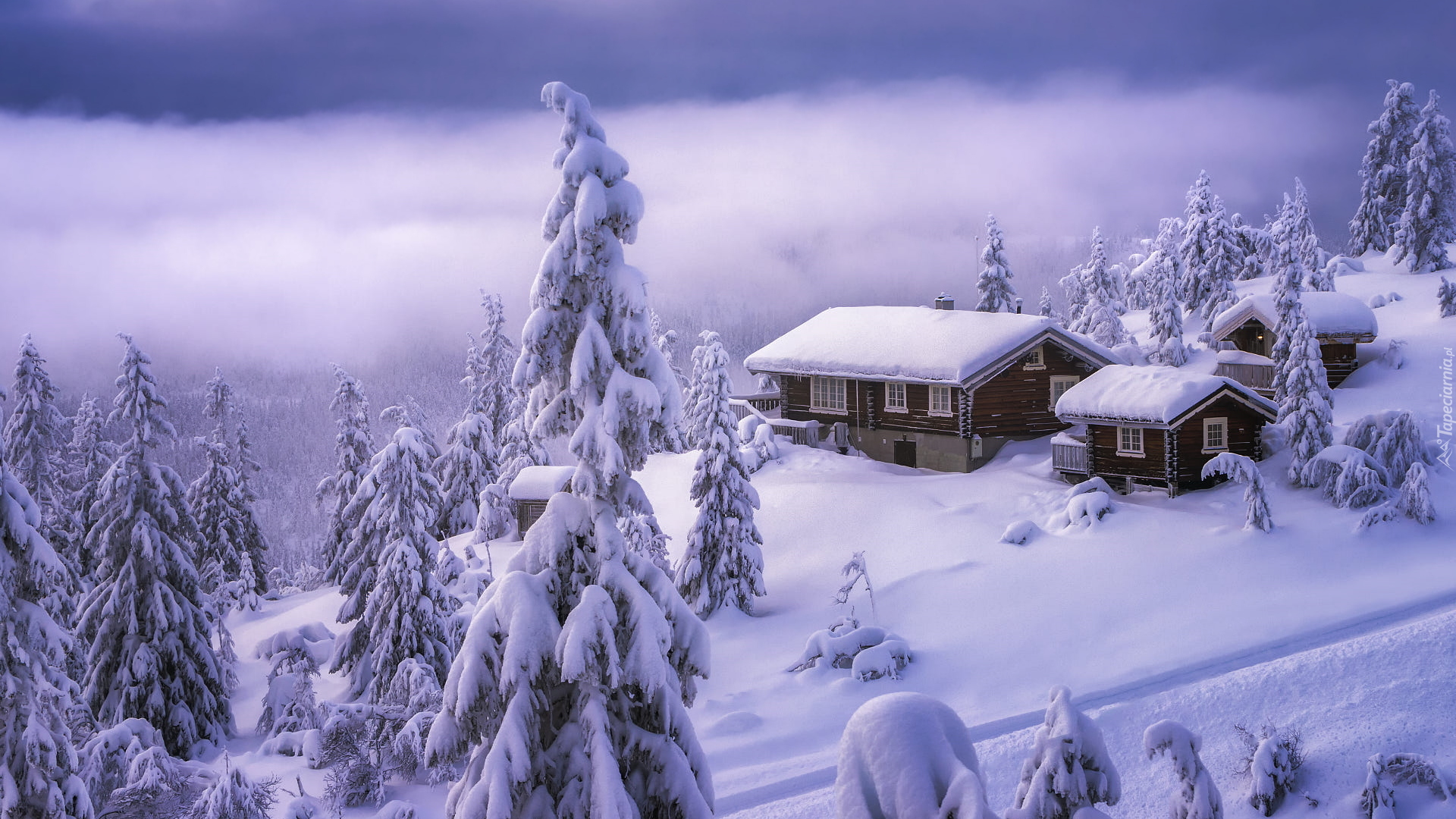 Edytor tapety: Ośnieżone drzewa i domy w Valdres