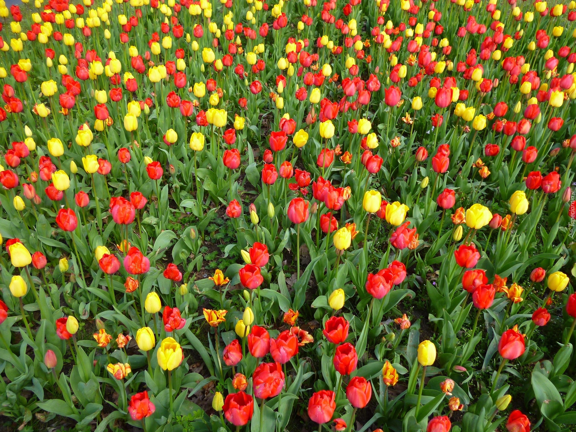 Edytor tapety: Żółte i czerwone tulipany na polu