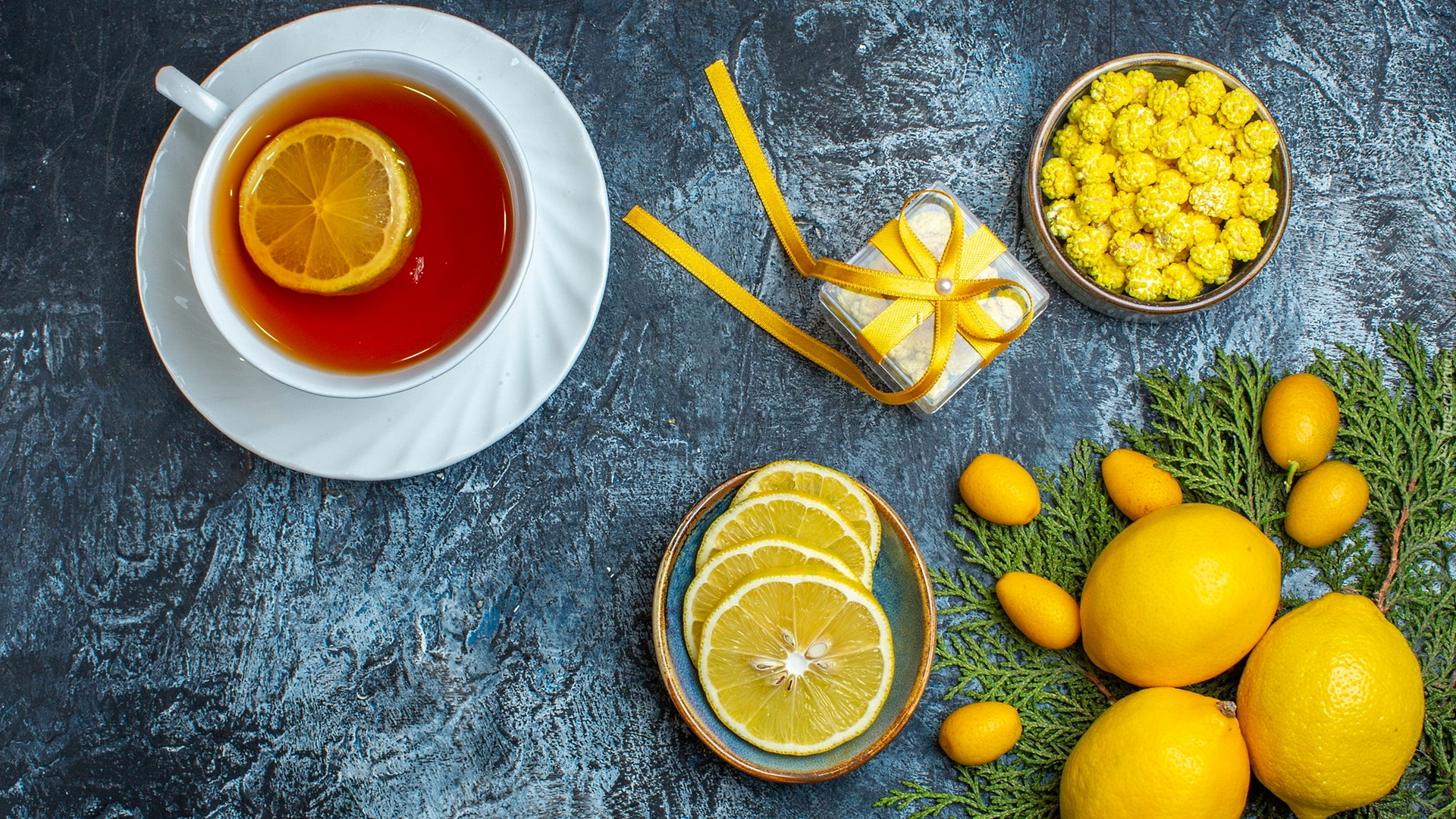 Edytor tapety: Filiżanka z herbatą obok prezentu i cytryn