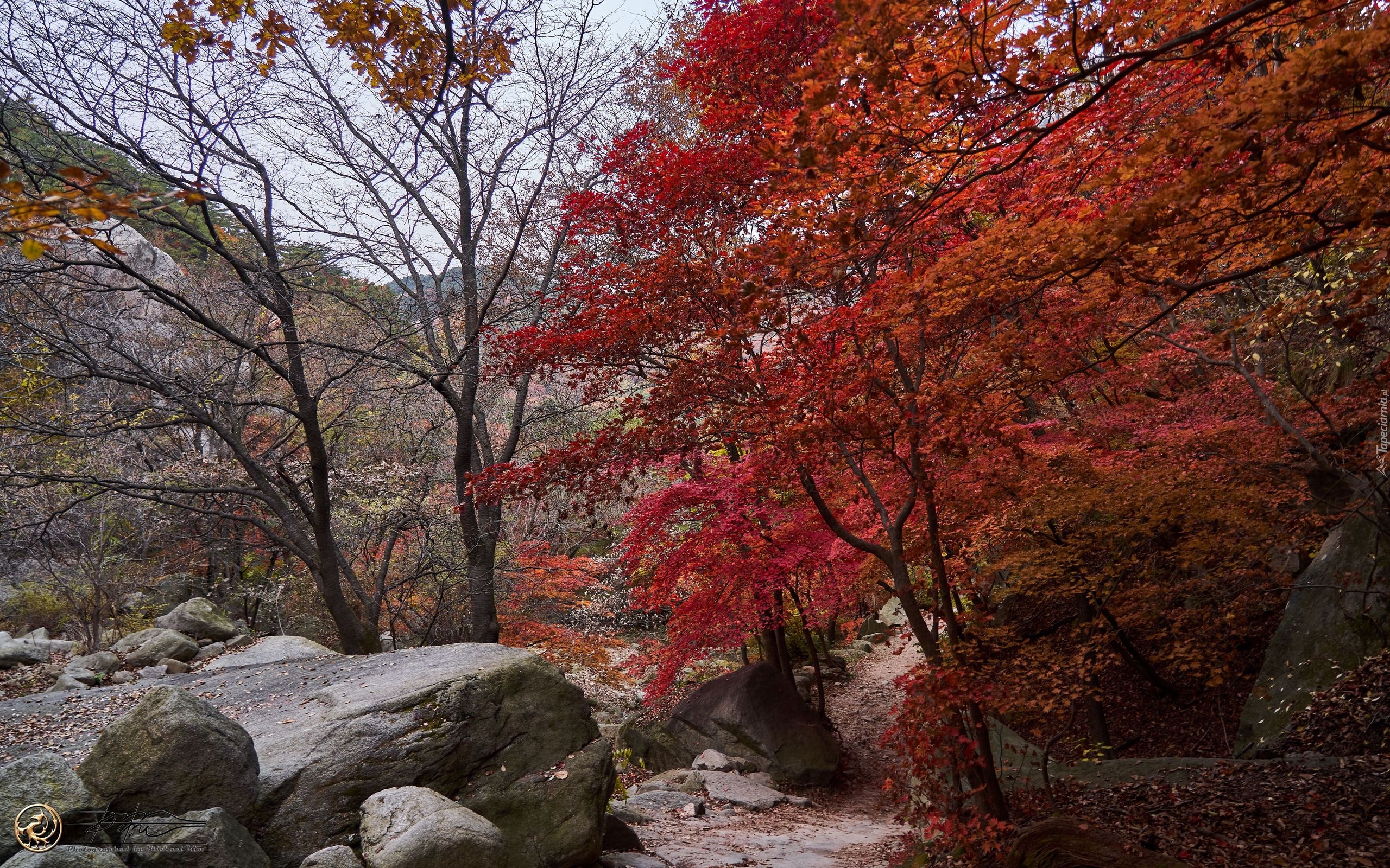 Edytor tapety: Kamienie i ścieżka pomiędzy jesiennymi drzewami