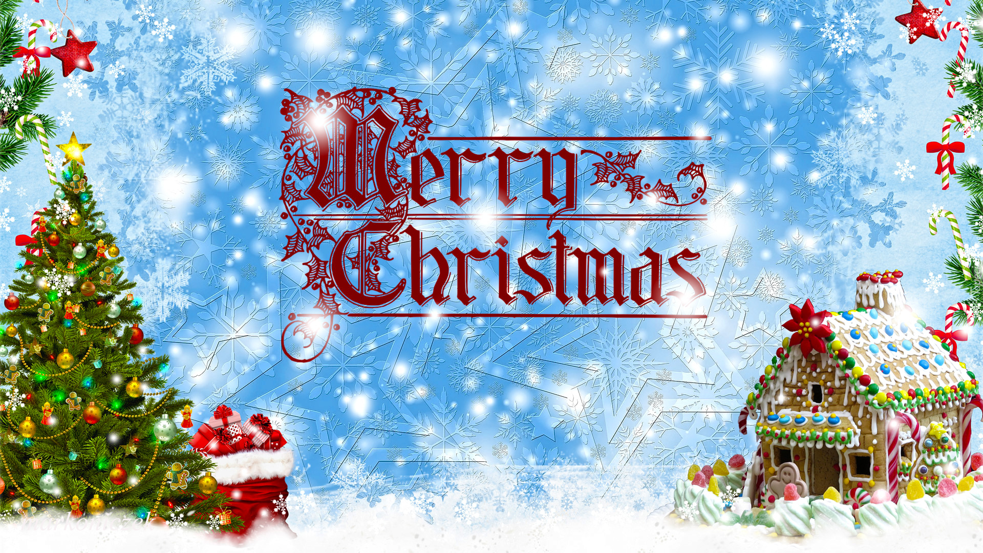 Edytor tapety: Choinka i domek na świątecznej kartce z życzeniami