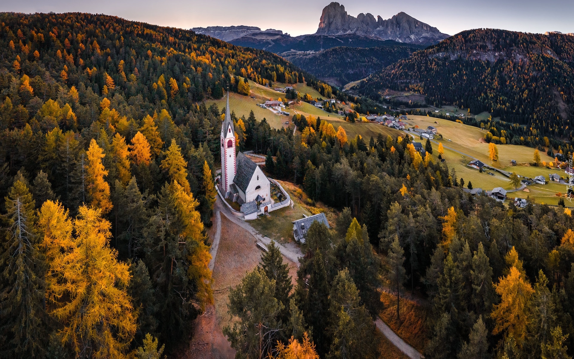 Edytor tapety: Kościół św Jakuba w Ortisei jesienną porą