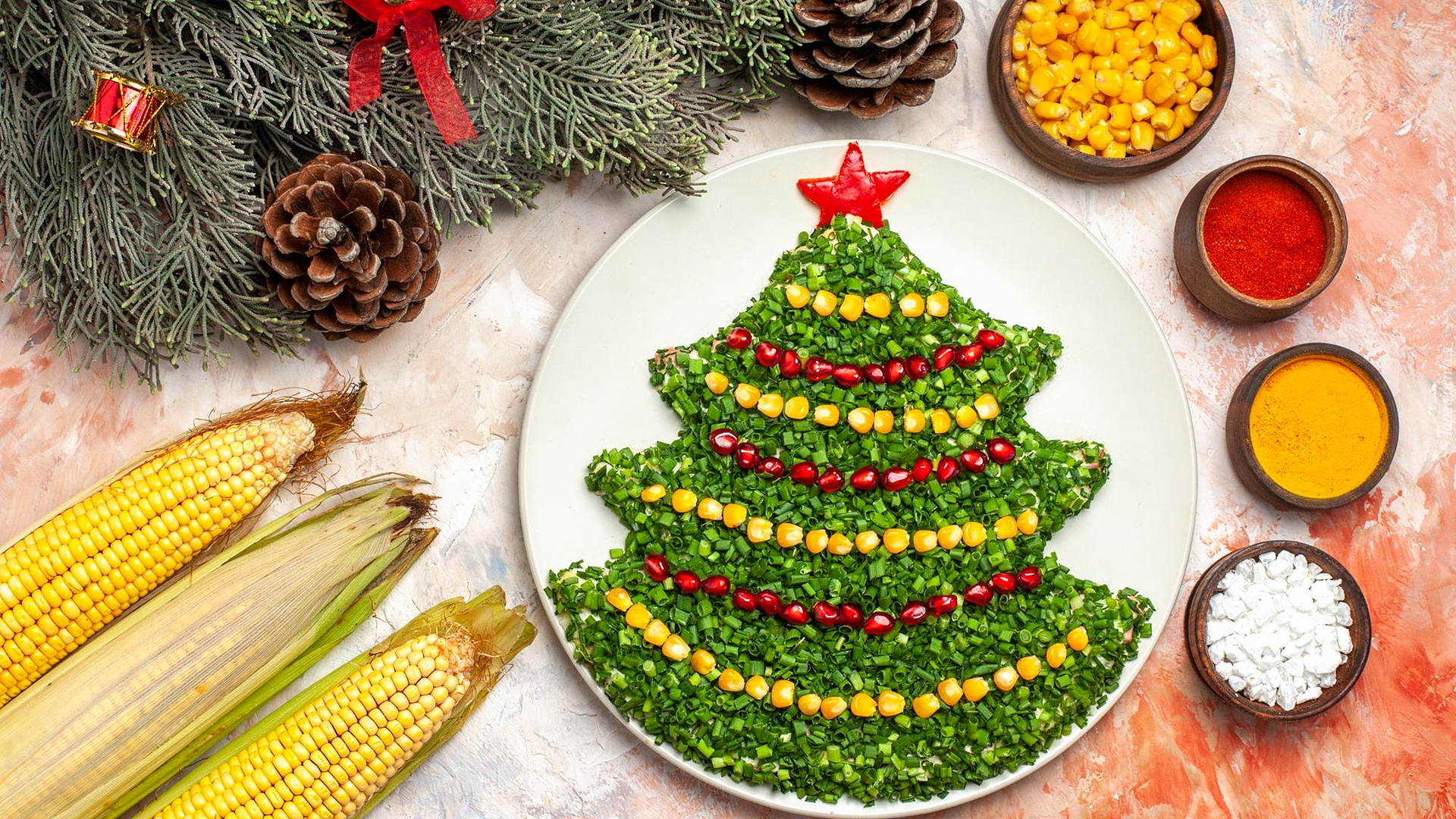 Edytor tapety: Choinka ze szczypiorku ozdobiona ziarnem granatu i kukurydzy