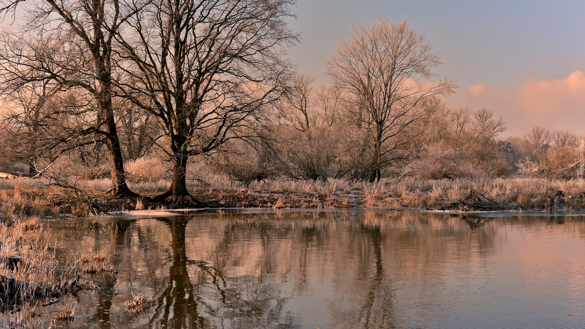 Edytor tapety: Oszronione drzewa i trawy nad stawem