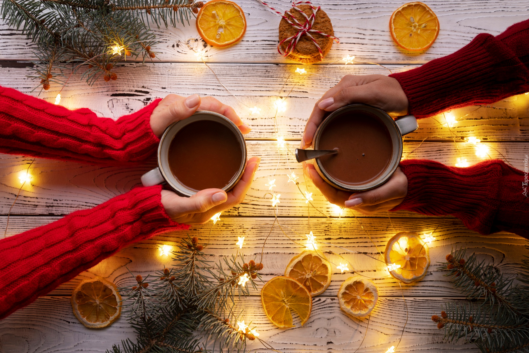 Edytor tapety: Kubki w dłoniach obok światełek świątecznych