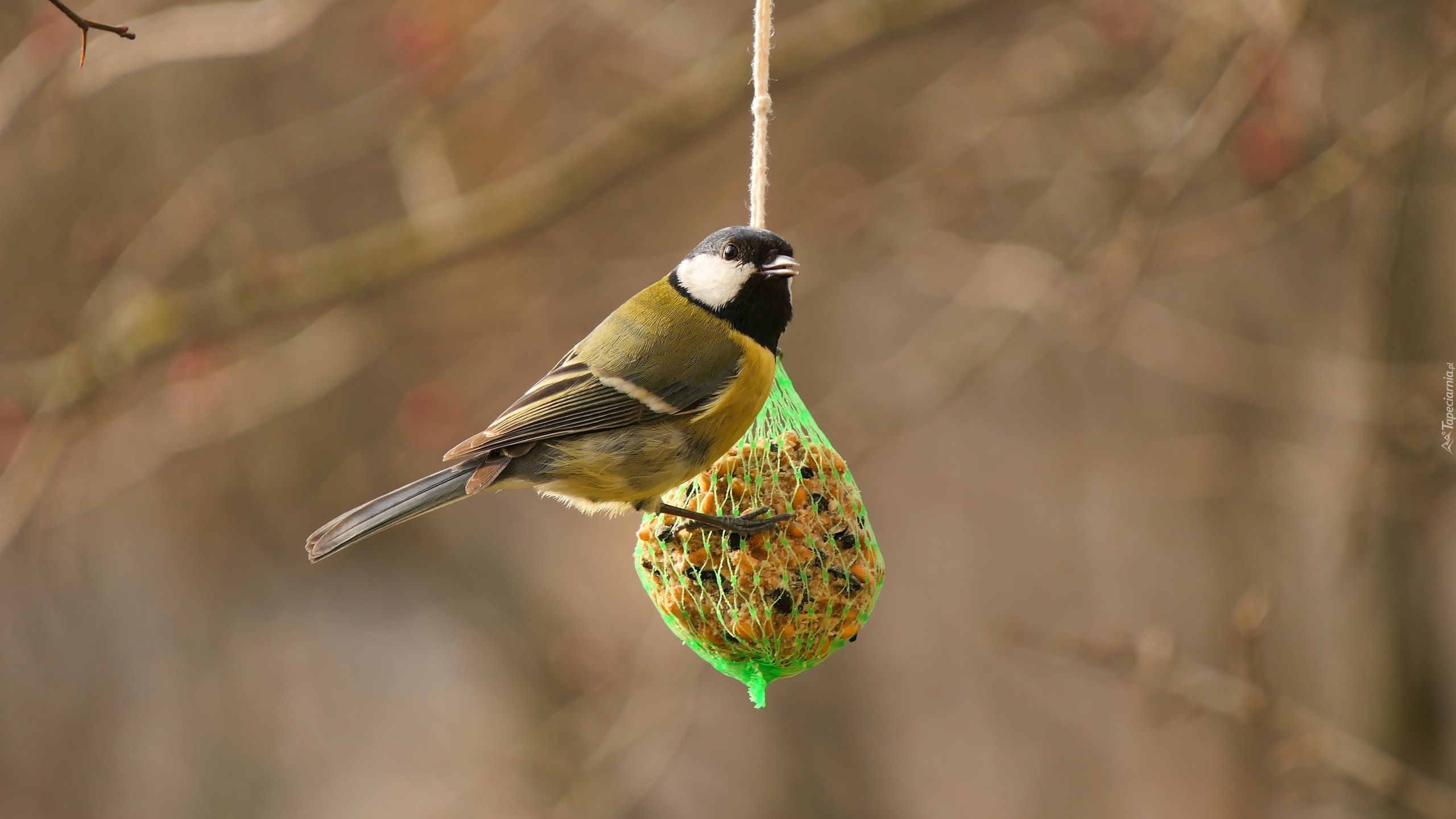 Edytor tapety: Sikora bogatka na siatce z jedzeniem