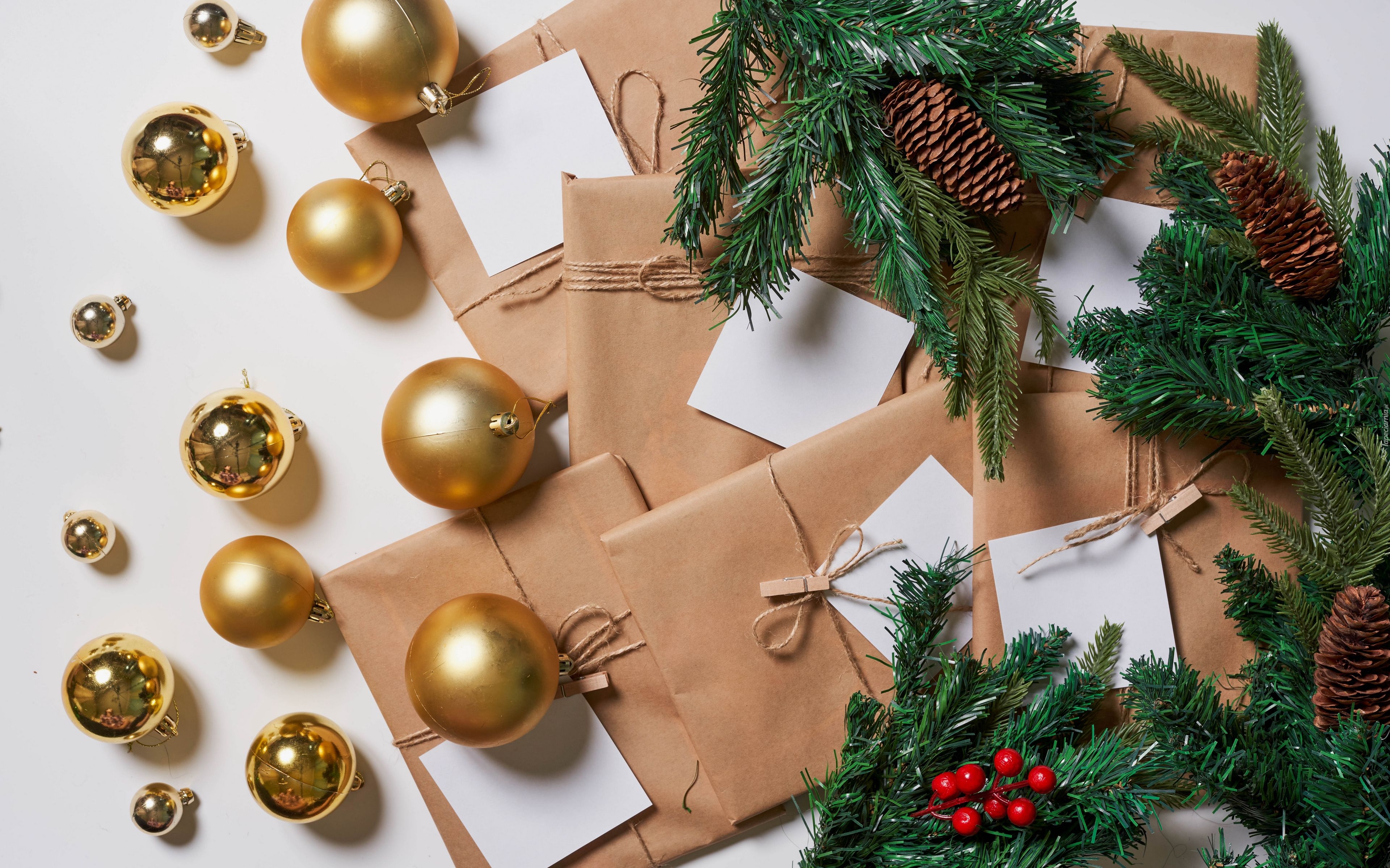 Edytor tapety: Bombki ułożone obok kopert i zielonych gałązek