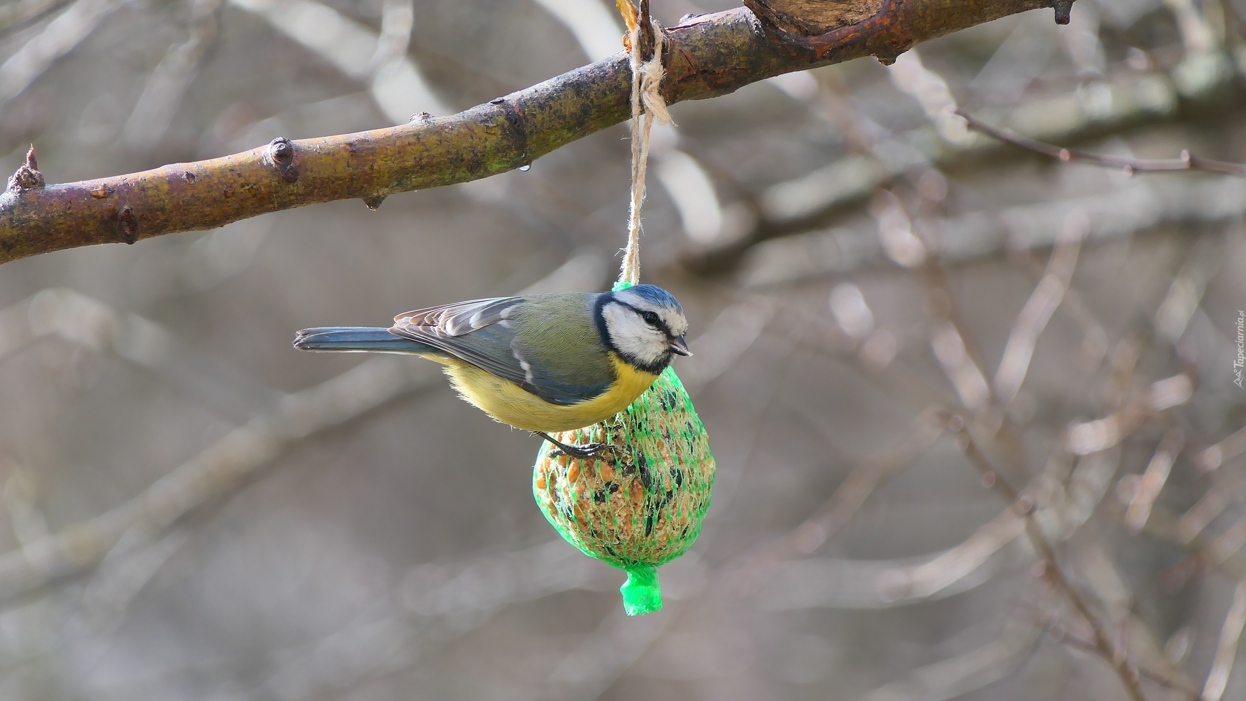 Edytor tapety: Sikora modra na woreczku z ziarnami