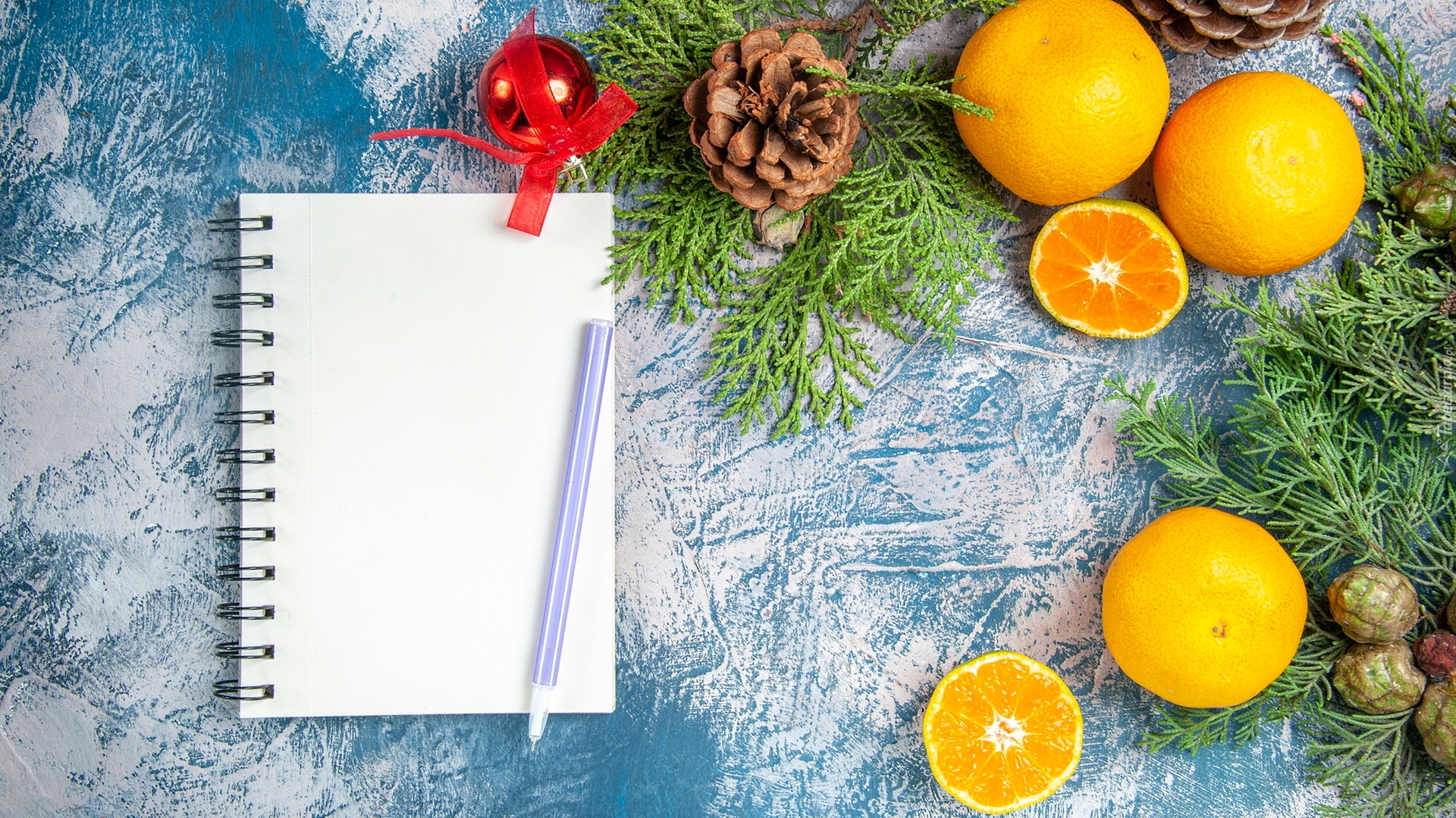 Edytor tapety: Mandarynki obok gałązek i notatnika
