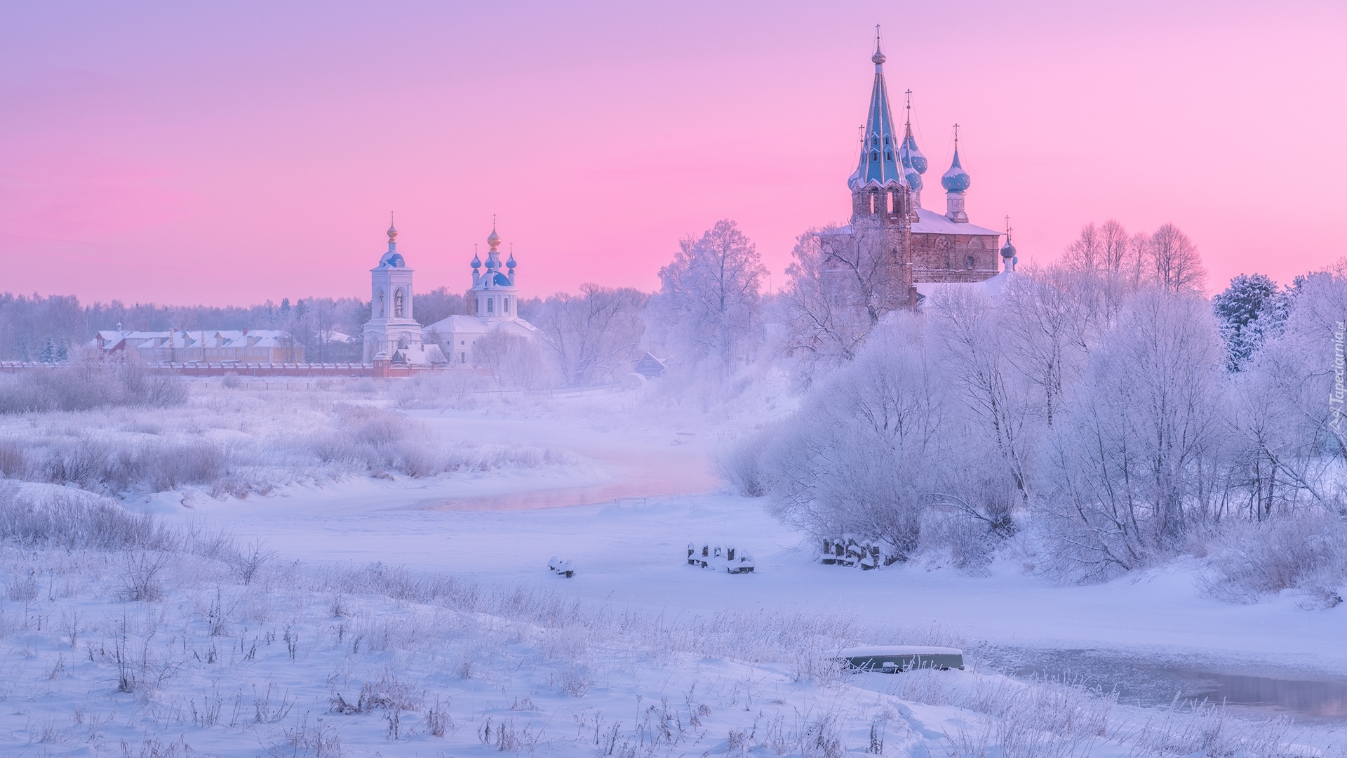 Edytor tapety: Cerkiew i ośnieżone drzewa we wsi Dunilovo