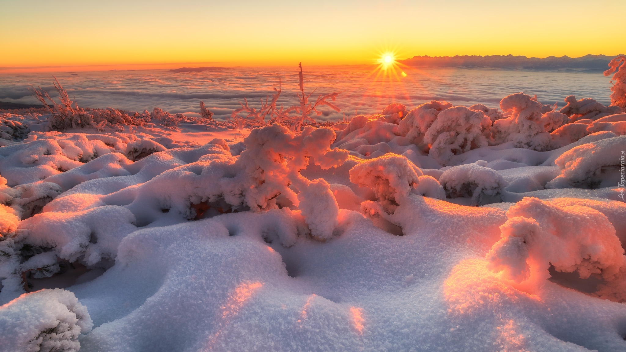 Edytor tapety: Zaśnieżone rośliny w promieniach słońca