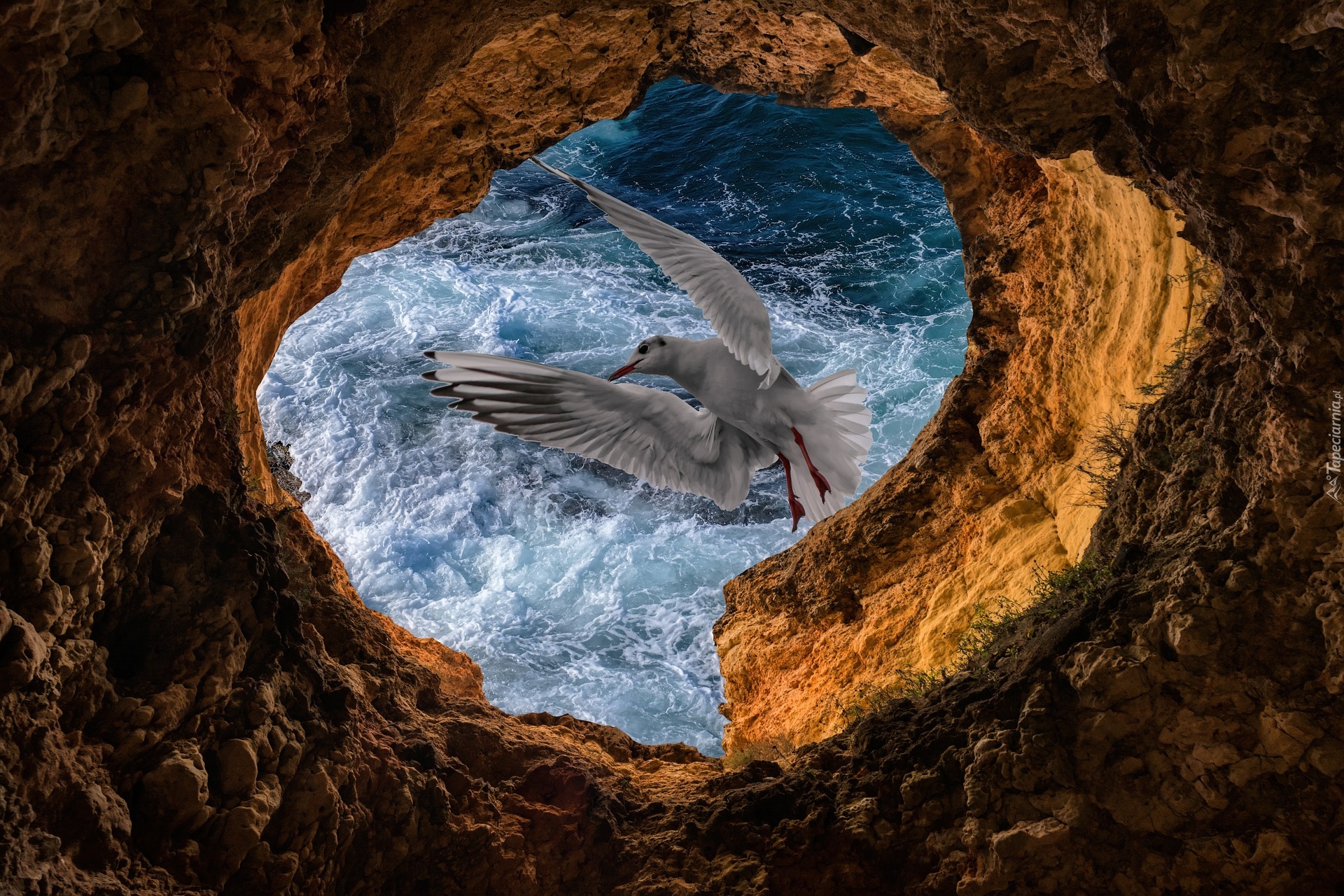 Edytor tapety: Widok z jaskini na mewę nad morzem