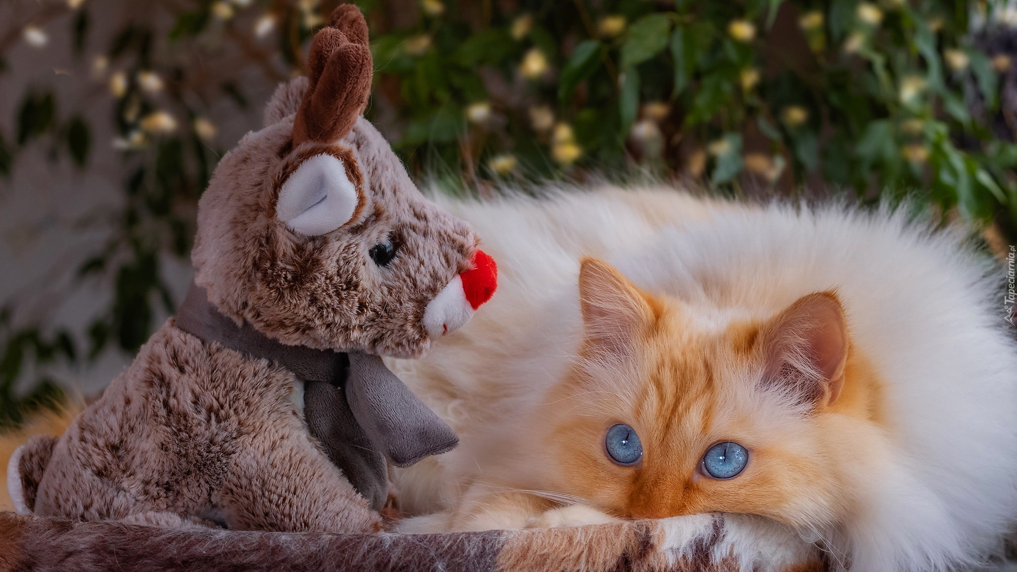 Edytor tapety: Rudawy kot obok pluszowego renifera