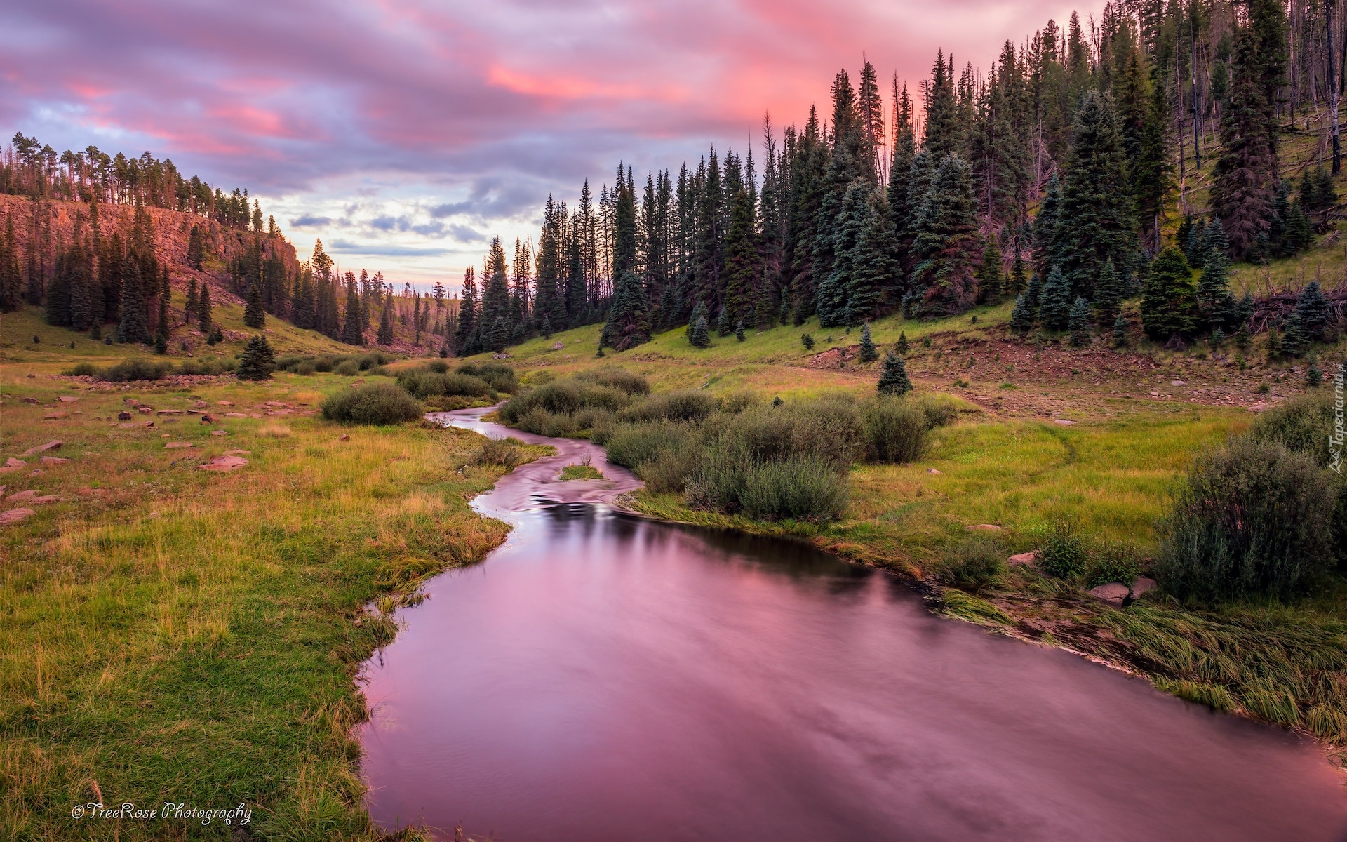 Edytor tapety: Drzewa i krzewy nad rzeką w zachodzącym słońcu