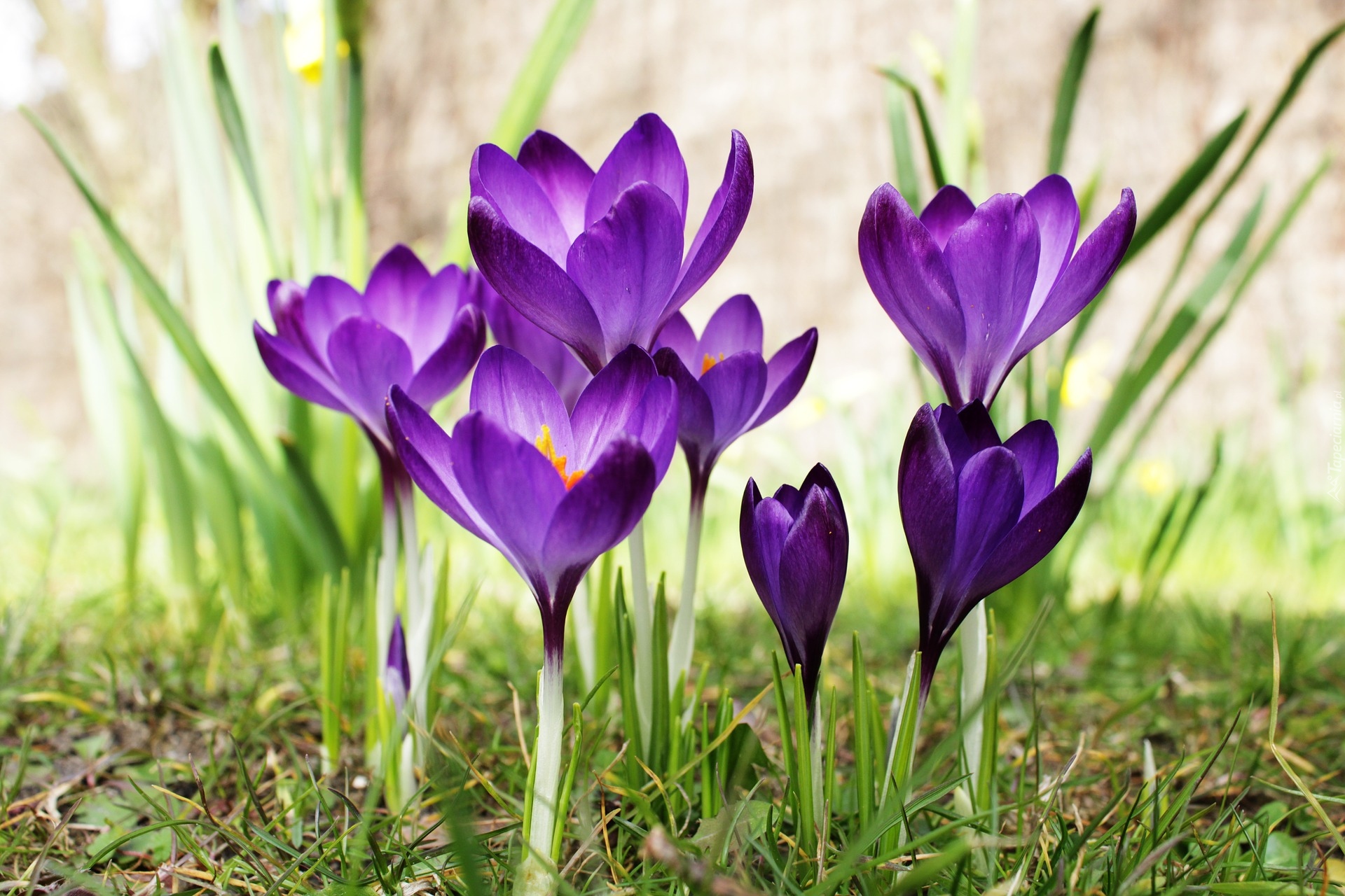 Edytor tapety: Kępka fioletowych rozwiniętych krokusów