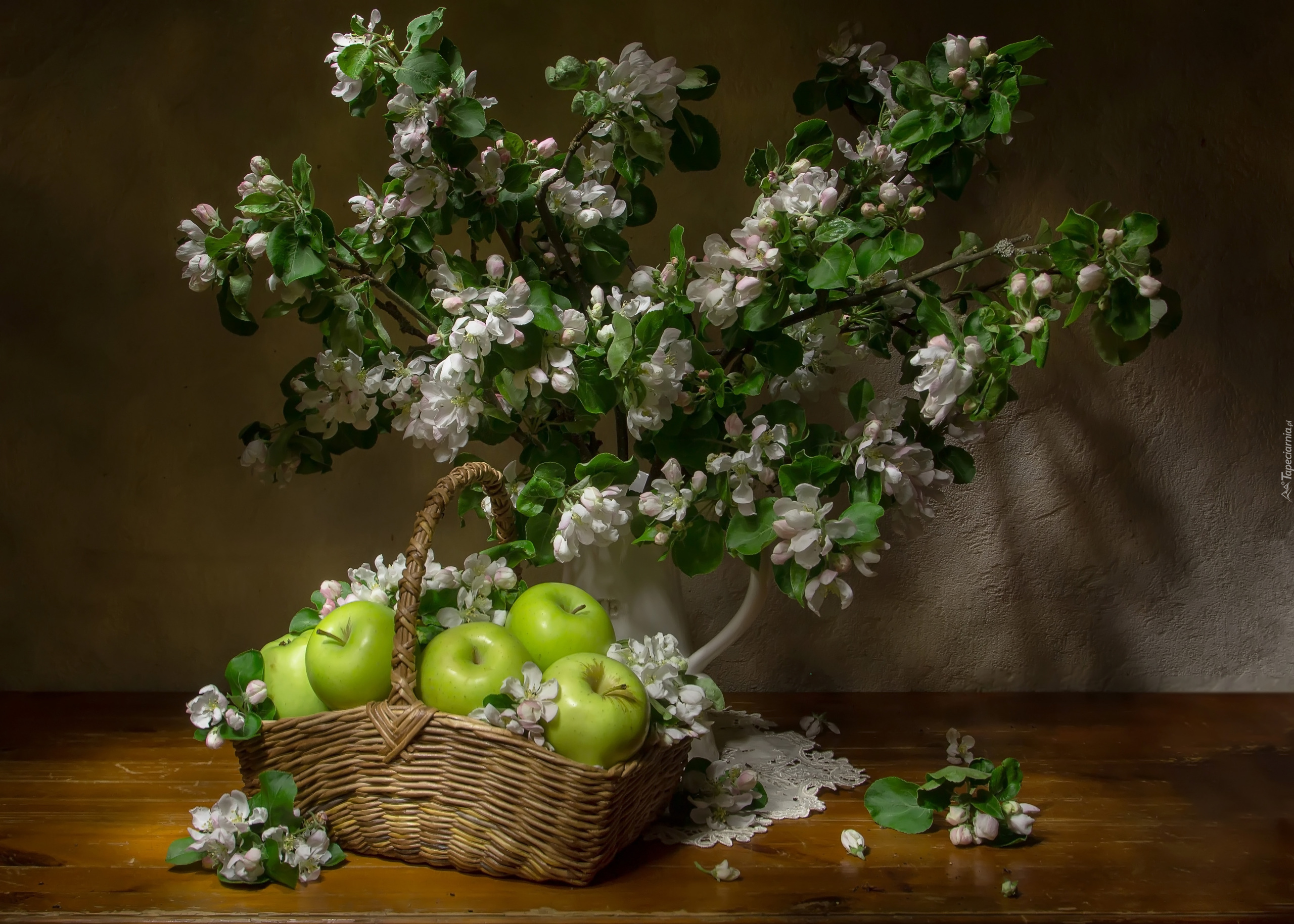 Edytor tapety: Gałązki jabłoni w dzbanku obok koszyczka z jabłkami