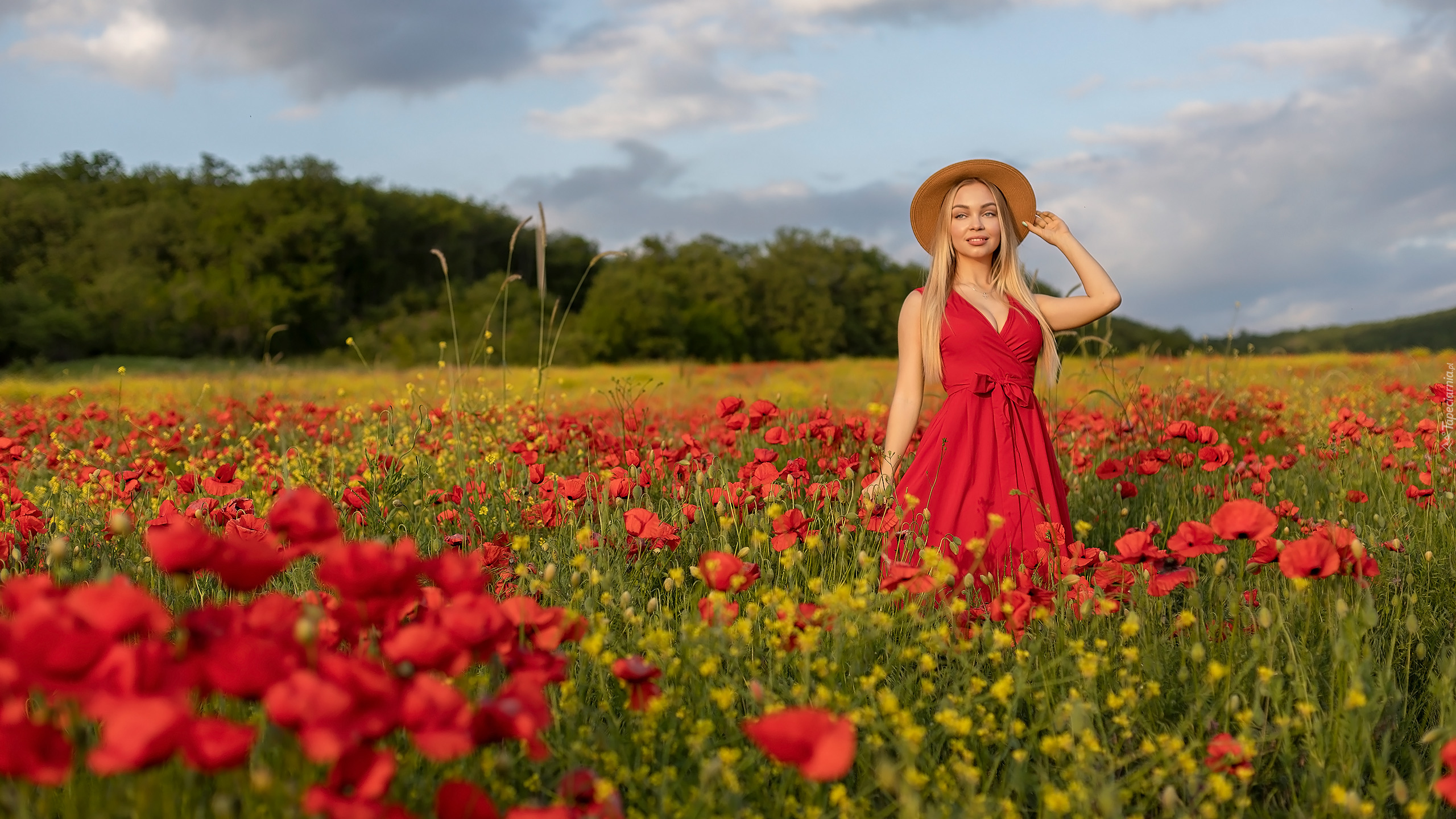 Edytor tapety: Kobieta w kapeluszu wśród czerwonych maków na łące