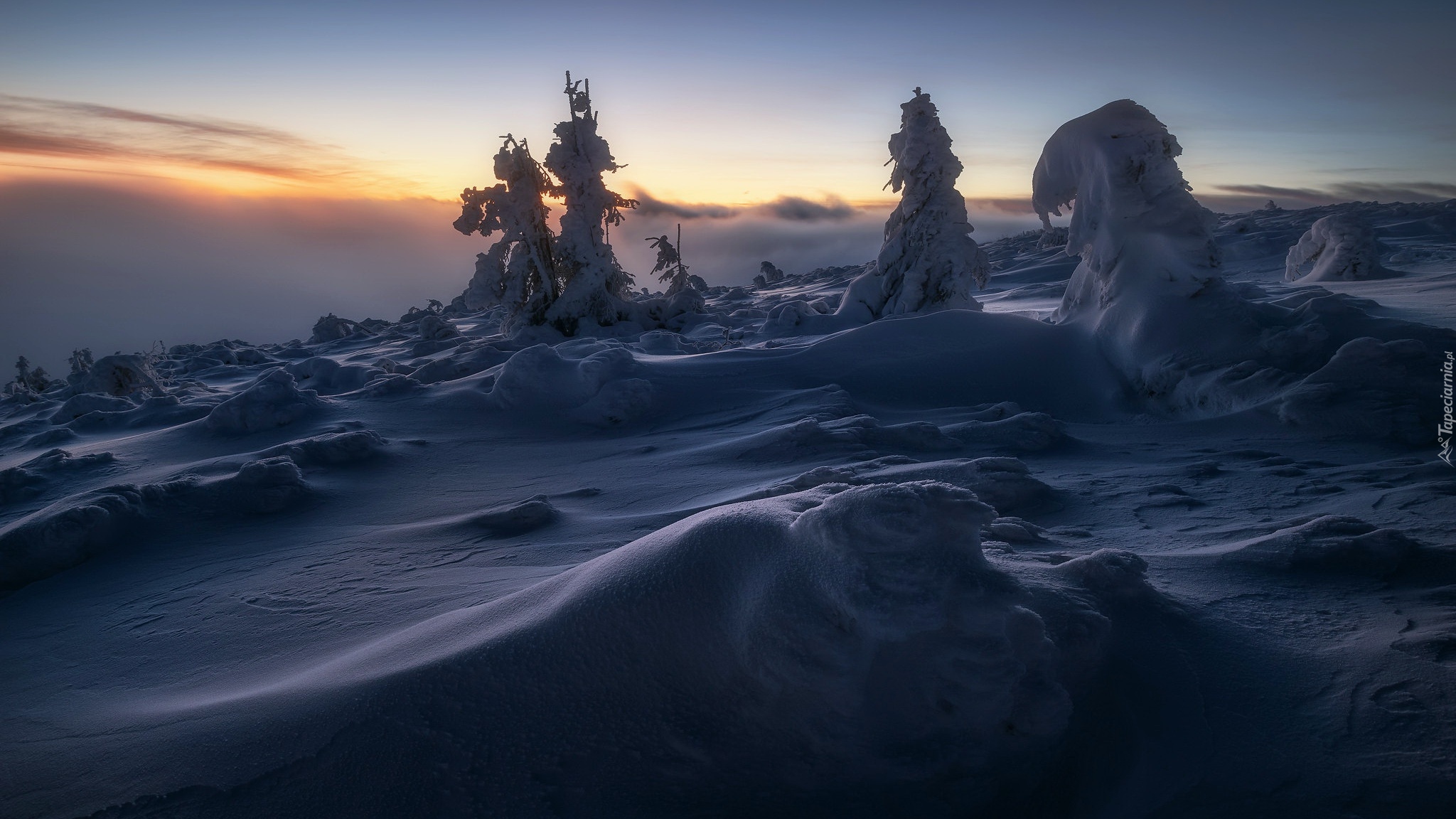 Edytor tapety: Zasypane śniegiem drzewa w zaspach o zmierzchu