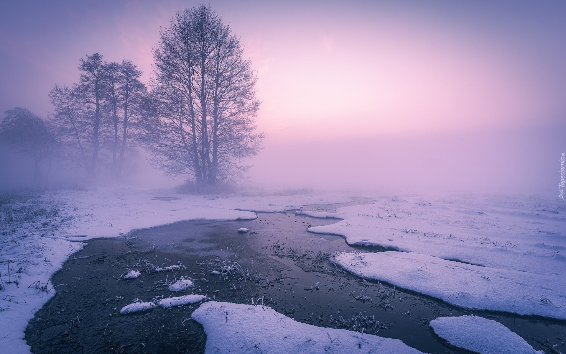 Edytor tapety: Drzewa i oblodzona rzeka we mgle