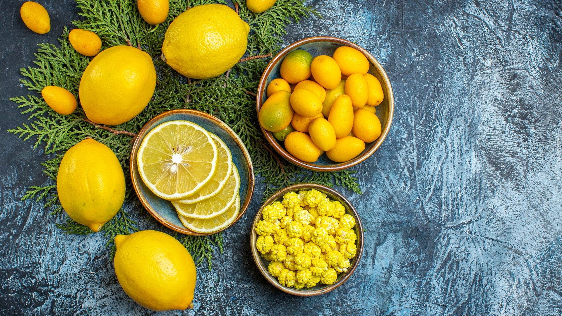 Edytor tapety: Cytryny na gałązkach i kumkwaty w miseczce