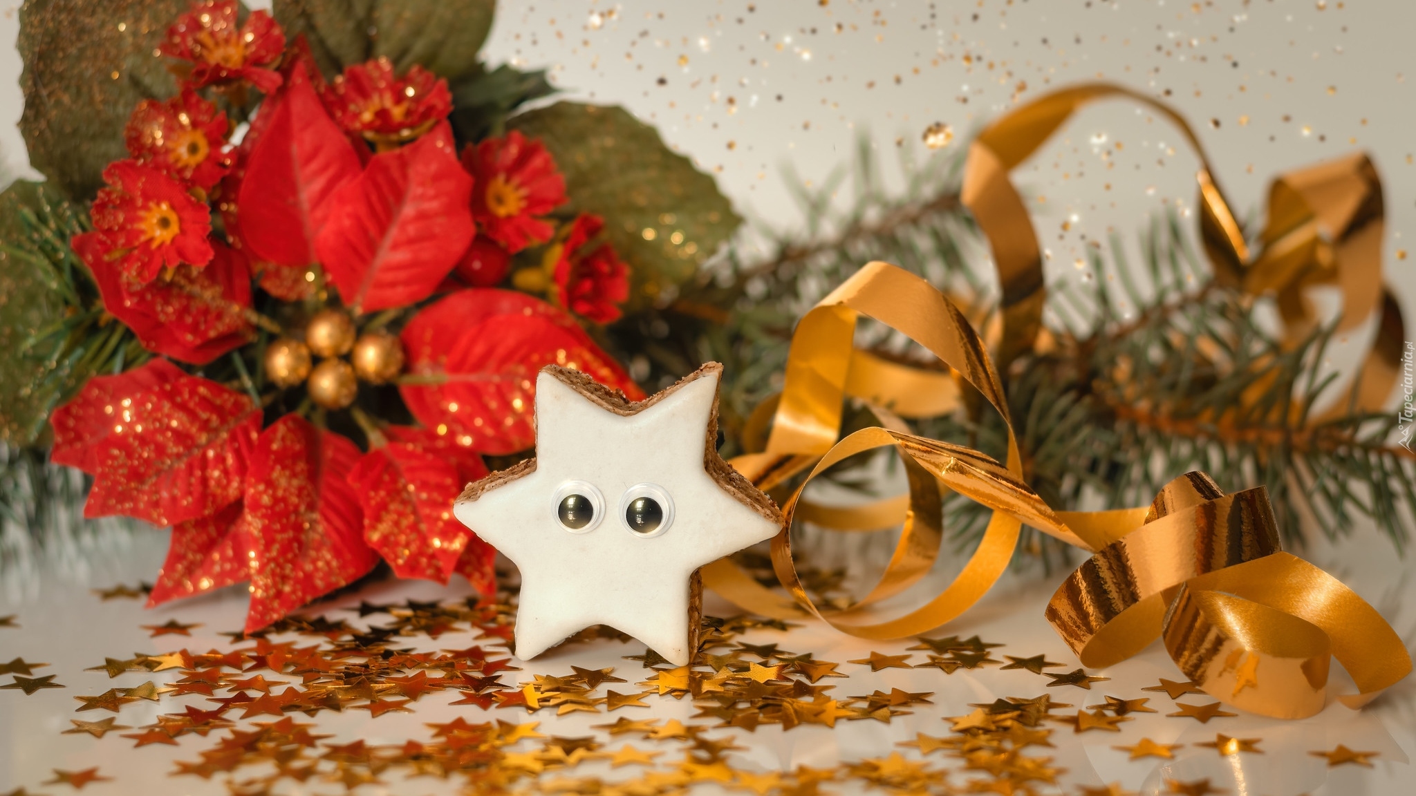 Edytor tapety: Pierniczek obok złotej wstążki i gwiazdy betlejemskiej