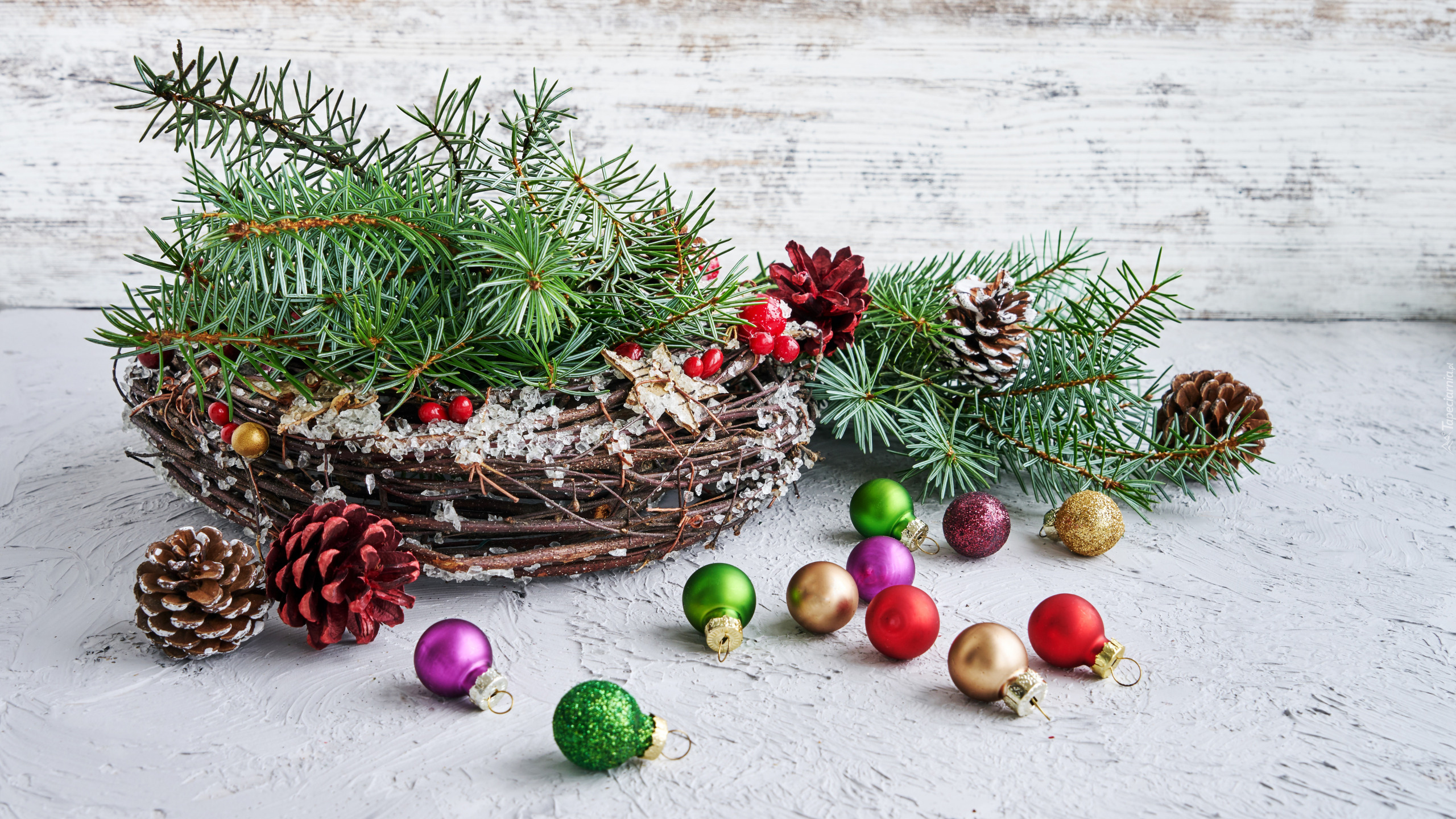 Edytor tapety: Bombki i szyszki obok zielonych gałązek