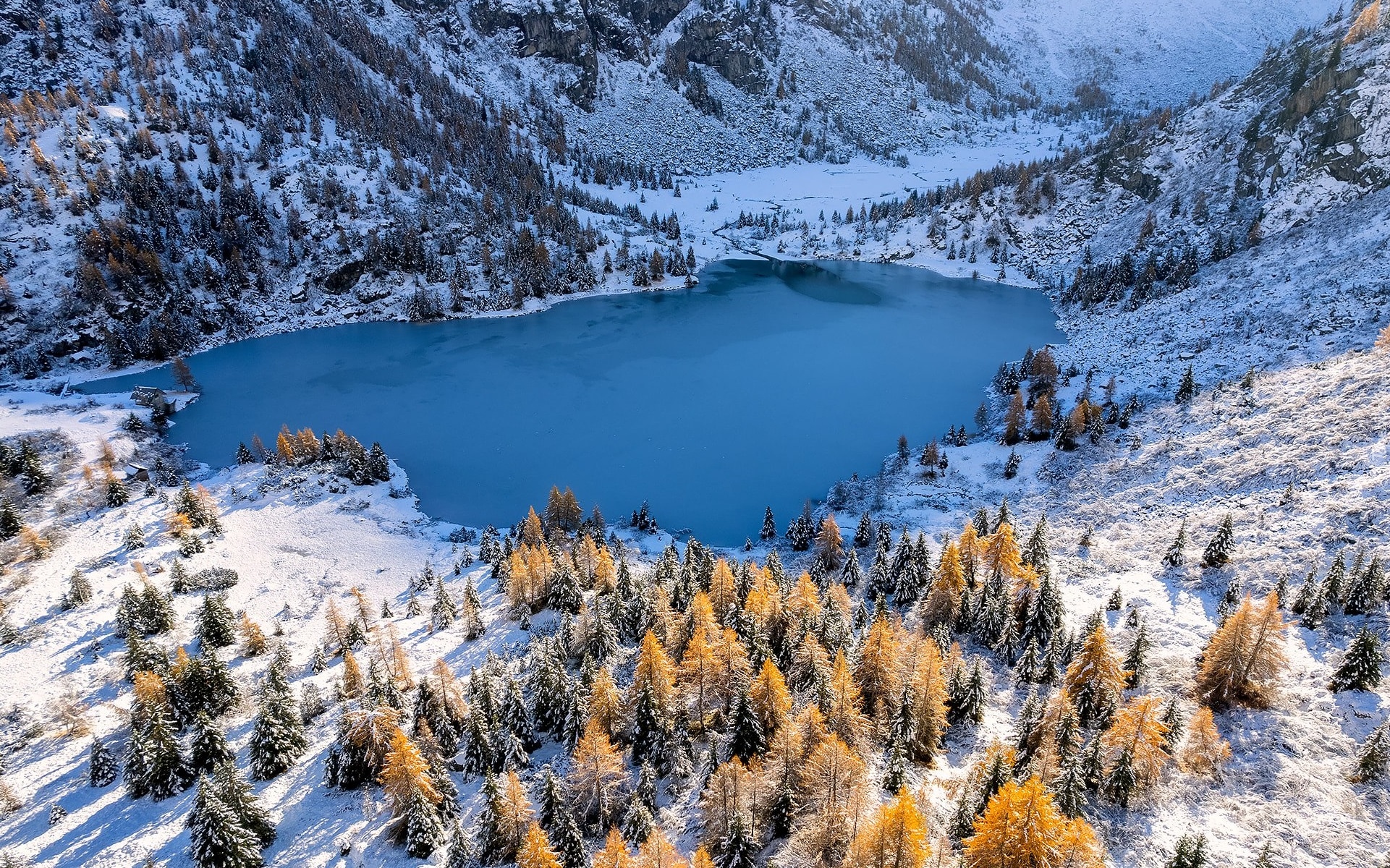 Edytor tapety: Ośnieżone drzewa i góry nad jeziorem Aviolo Lake