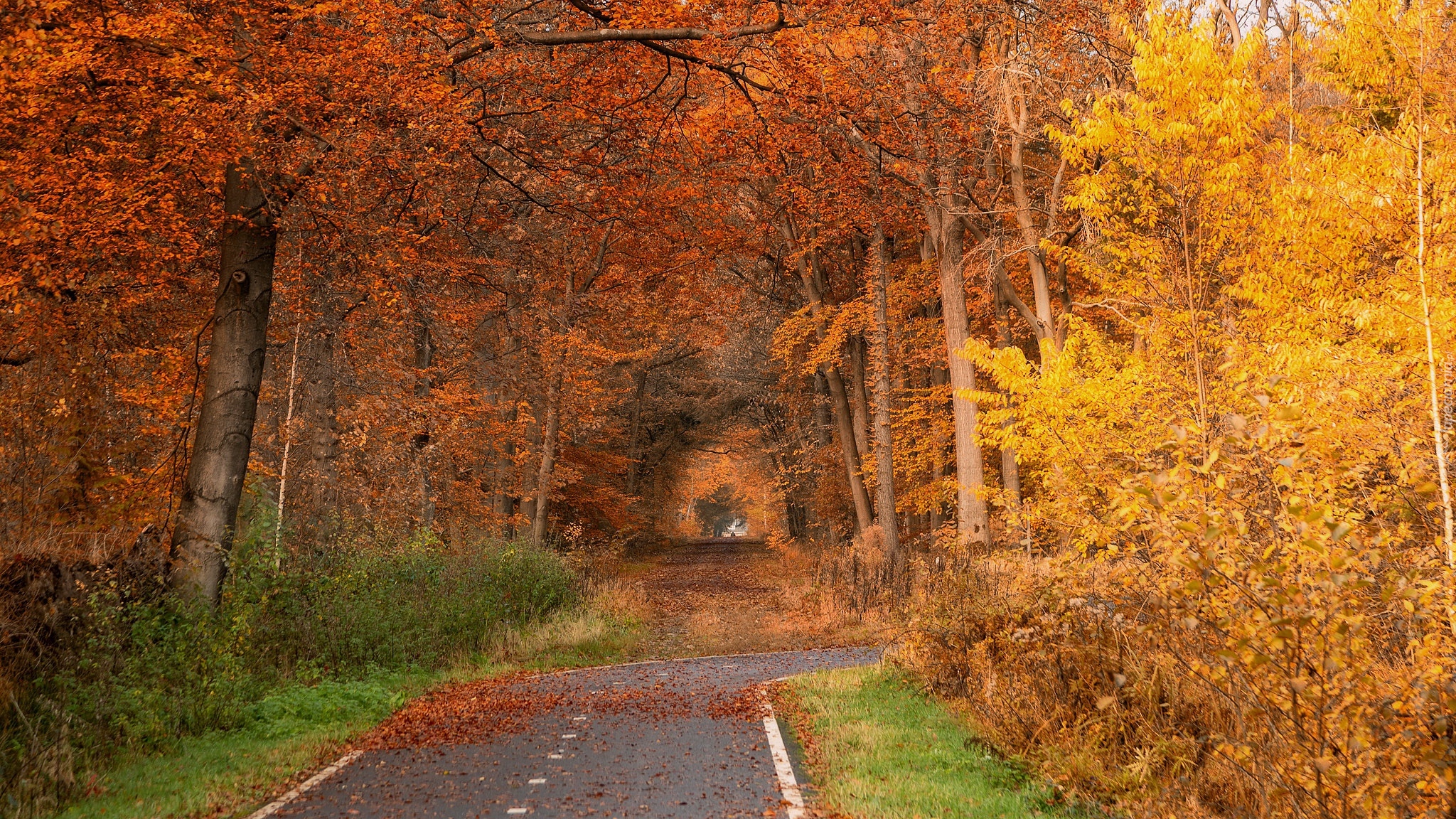 Edytor tapety: Opadłe liście na drodze pośród jesiennych drzew