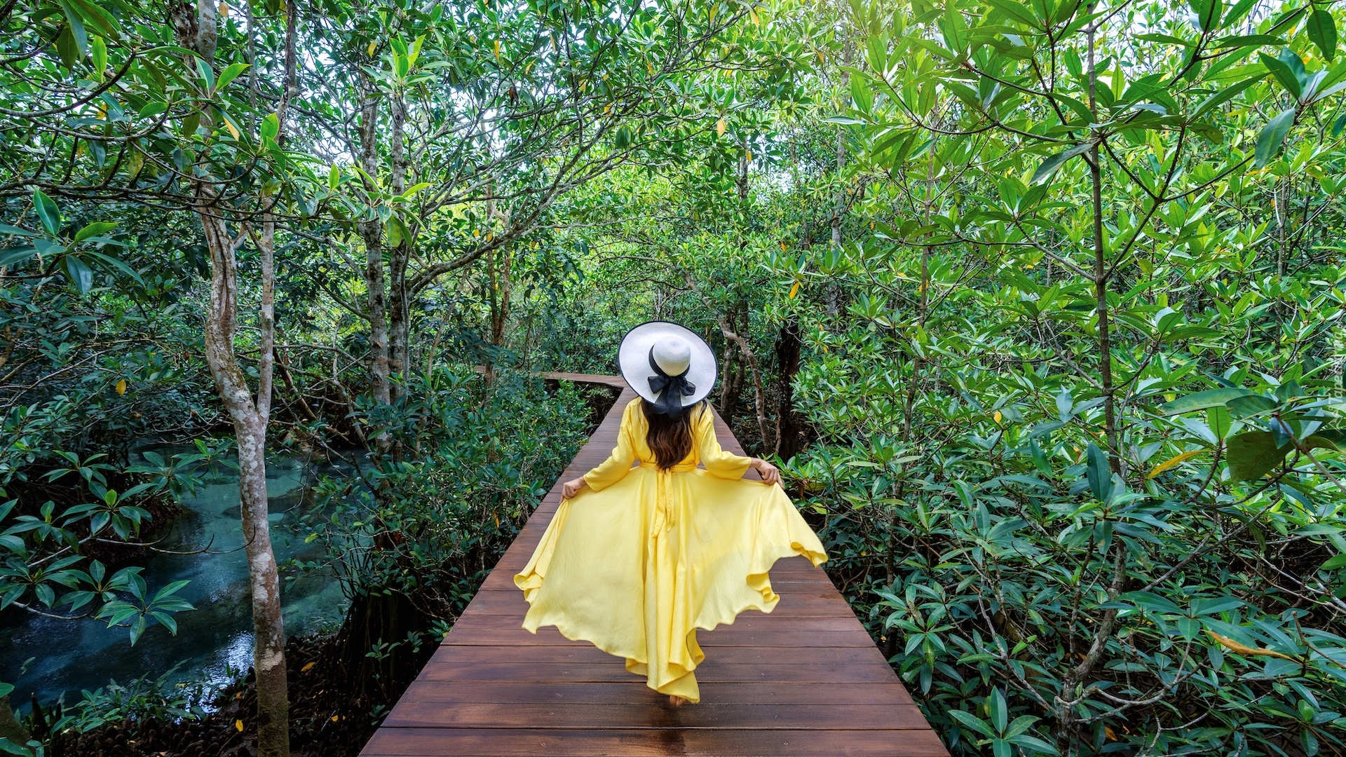 Edytor tapety: Kobieta w żółtej sukience i kapeluszu