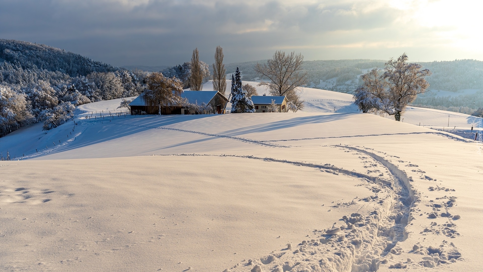 Edytor tapety: Domy na wzgórzu przysypane śniegiem