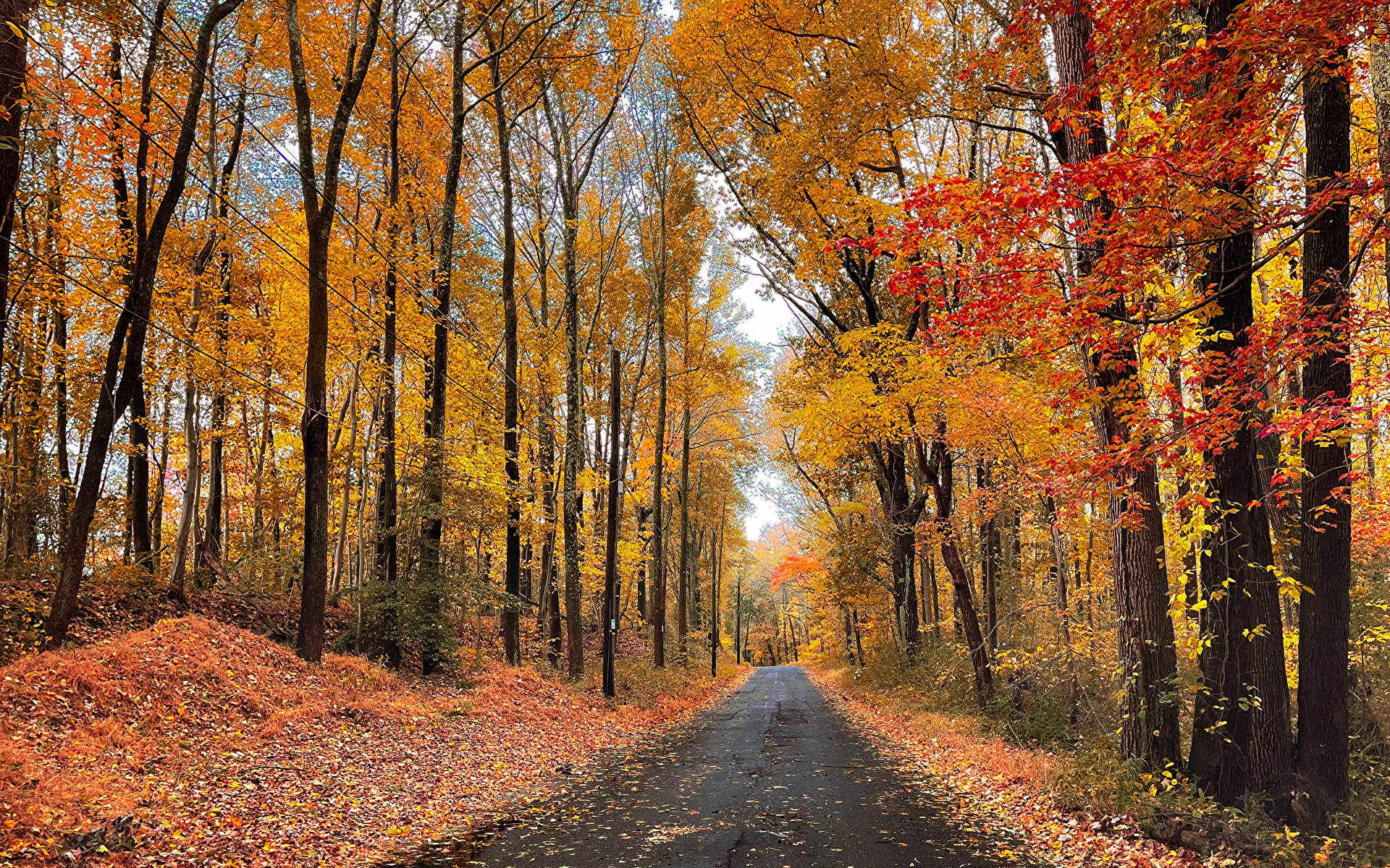 Edytor tapety: Opadłe jesienne liście pod drzewami wzdłuż drogi