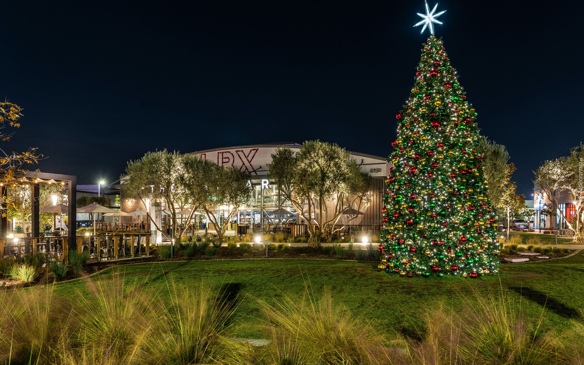 Edytor tapety: Udekorowana choinka przed budynkiem