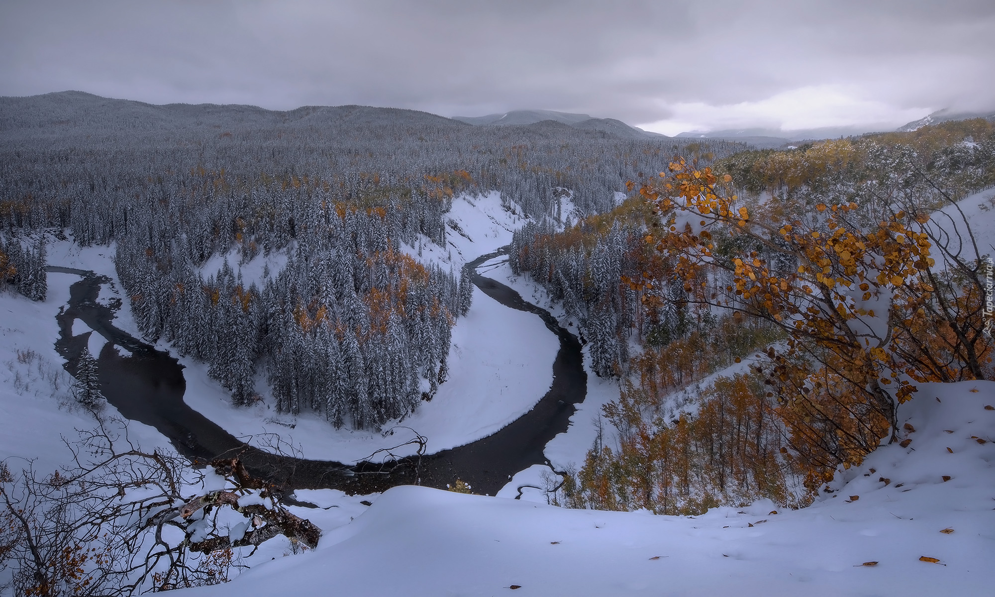 Edytor tapety: Ośnieżony las przy zakolu rzeki